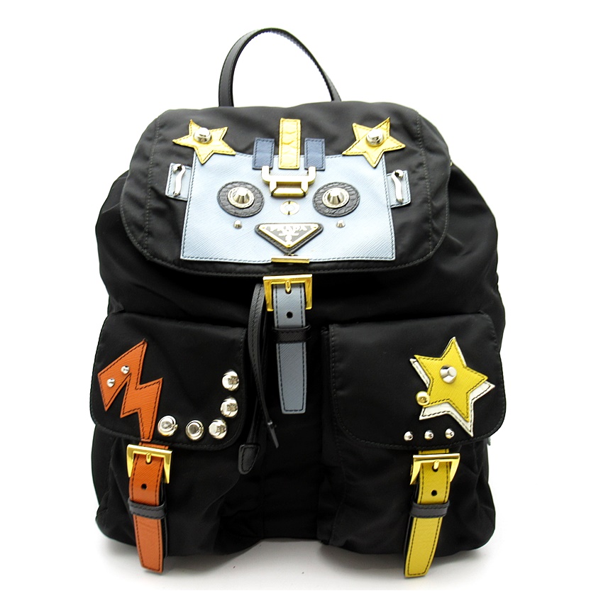 USED品。プラダ、ナイロンリュック・ロボットモデル使い勝手抜群の大人気バッグです。ポップなロボットがかわいい、遊びごころいっぱいのデザインとなっており、ナイロン部分は定番のブラックカラー、軽量且つ耐久性に優れた素材のリュックです。