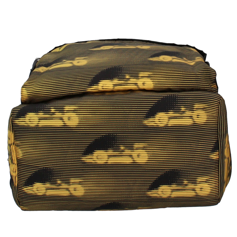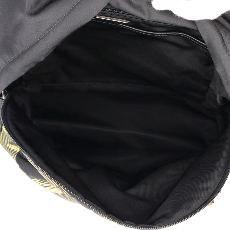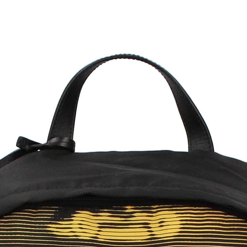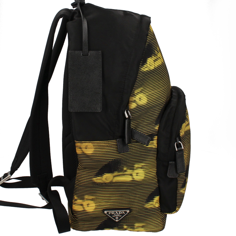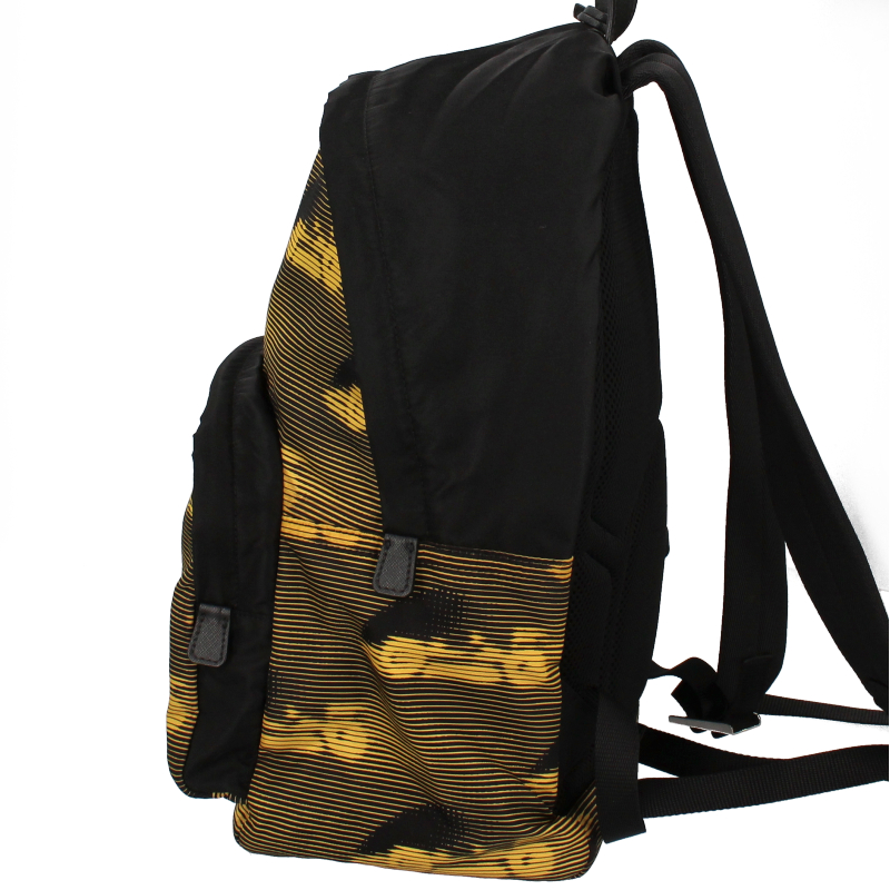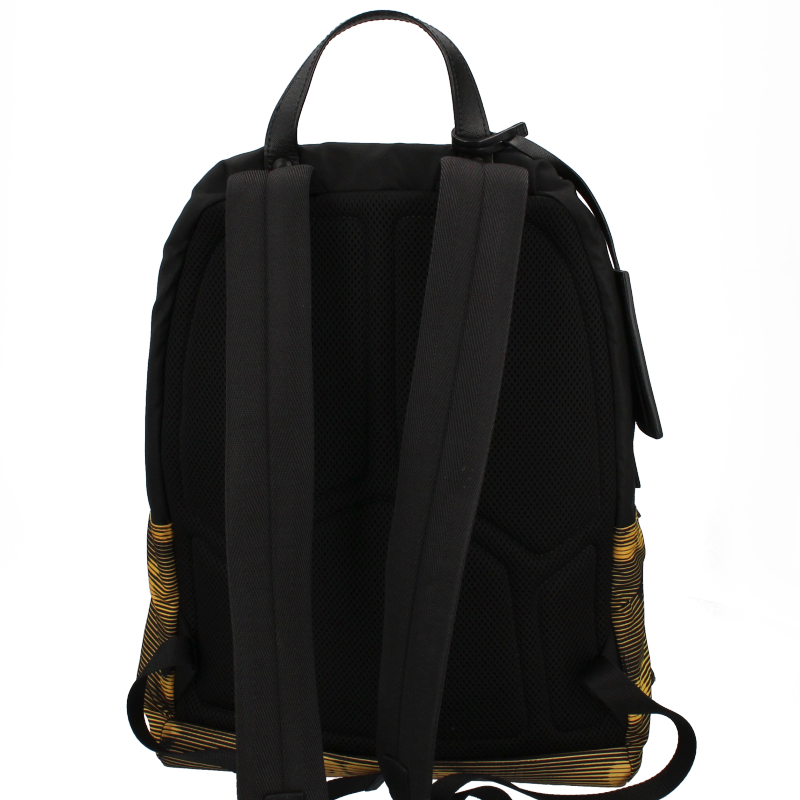 USED品。ブラックの無地ナイロン×レザーに三角ロゴプレートがスタイリッシュなリュックです。ファスナー開閉でA4サイズも入り、豊富なポケットが付いて収納力抜群。背面は通気性の良いメッシュ素材。通勤通学から普段使いはもちろん、旅行などマルチに大活躍です。