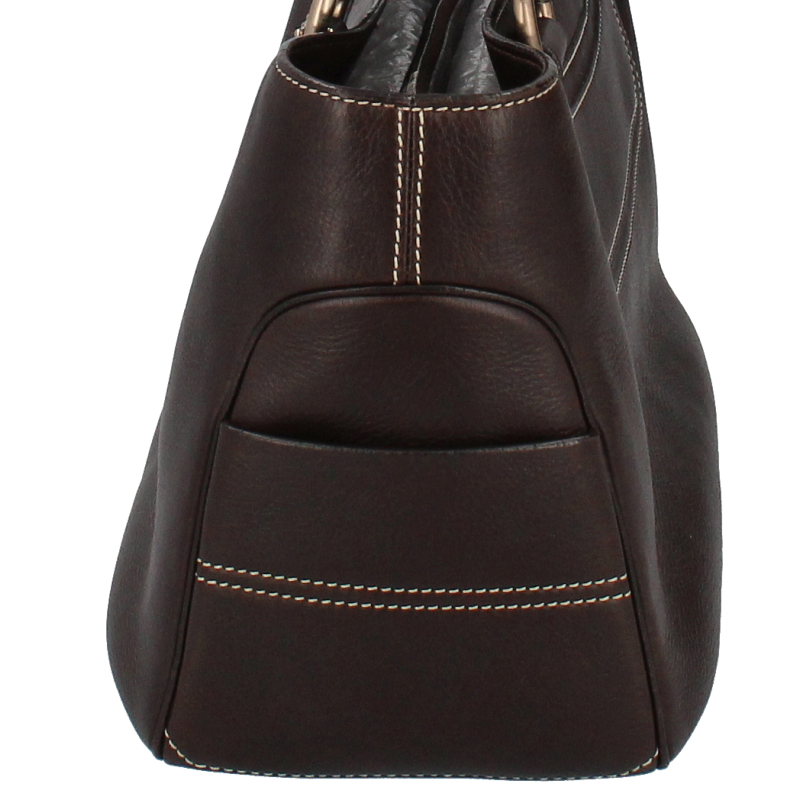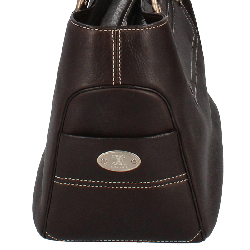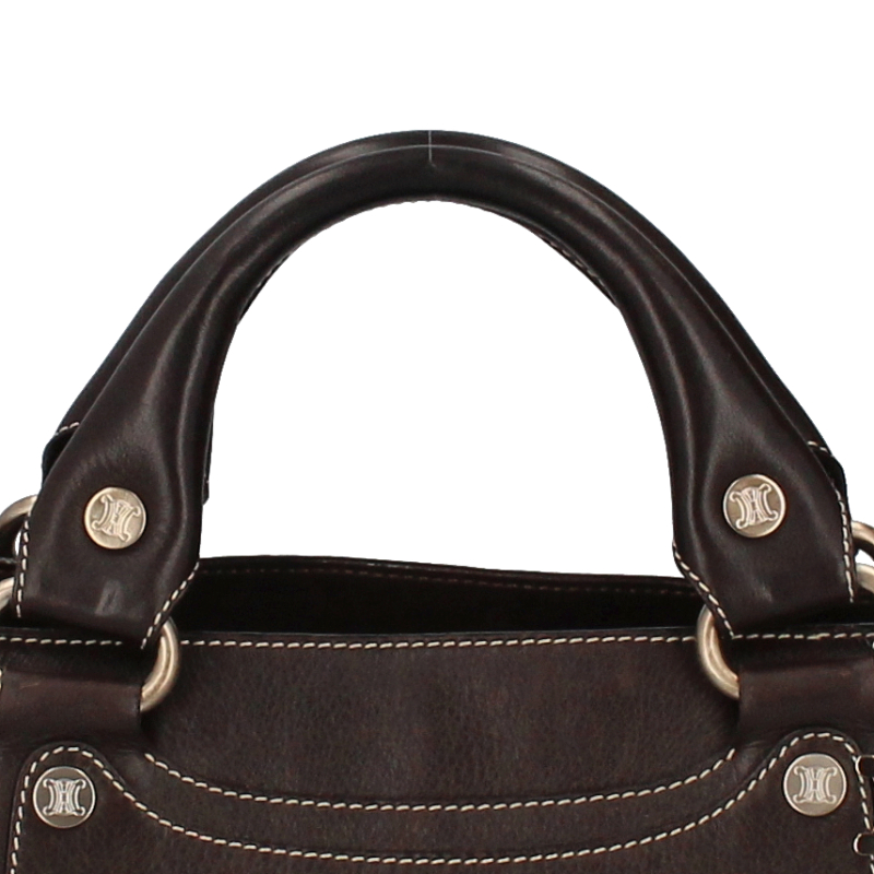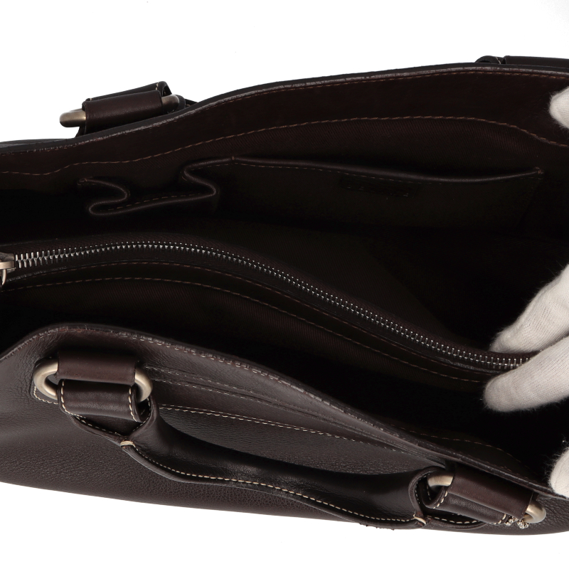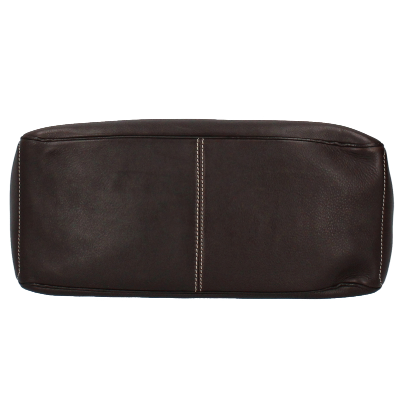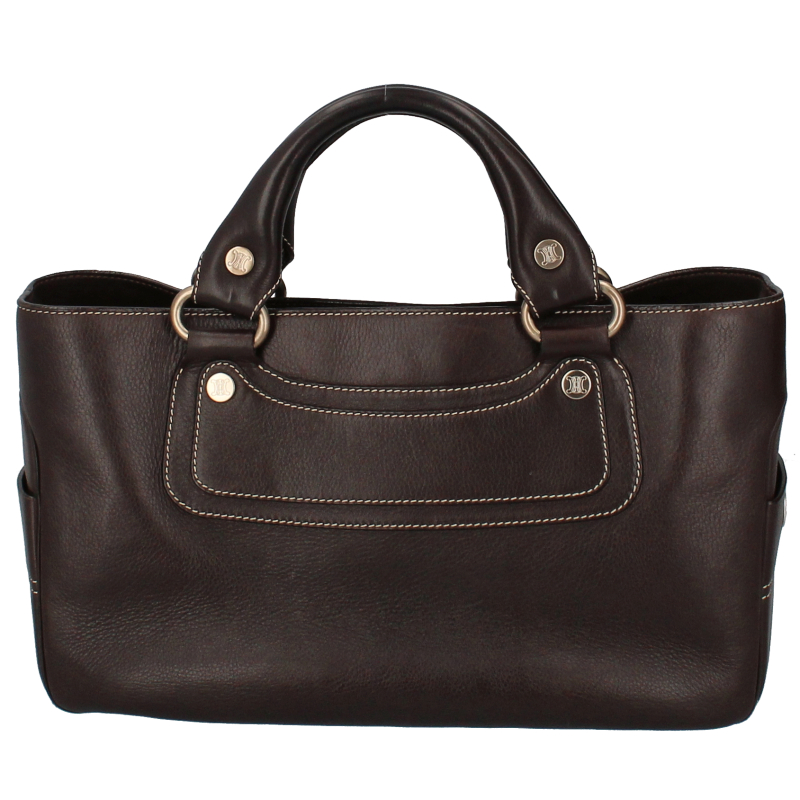 USED品。シンプルながらもボタン金具にあしらわれたブランドのロゴが主張しすぎない上品なハンドバッグです。しっかり間口が開くので、使いやすいこと間違いなしです。
