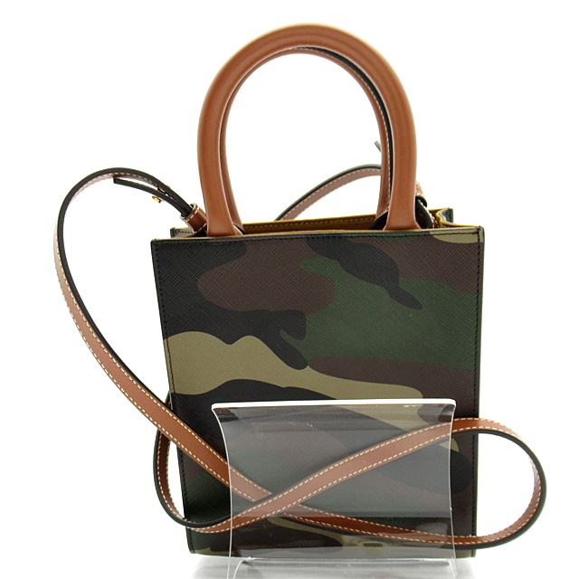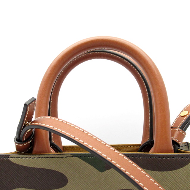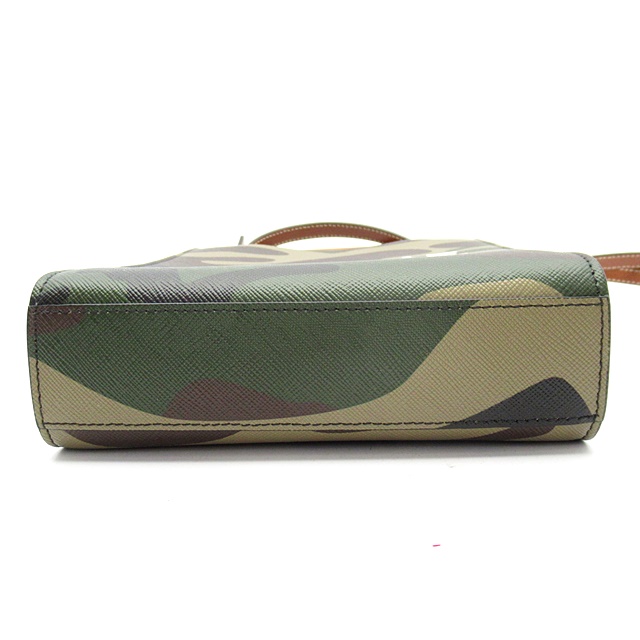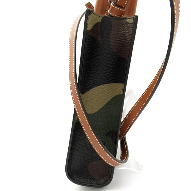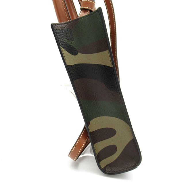 USED品。迷彩柄の丈夫なコーティングキャンバス地にレザーディティールが上品でカジュアルな印象のスクエア型のショルダーバッグ。ショルダーストラップは取り外し可能なので、ハンドバッグとしてもお使いいただけます。