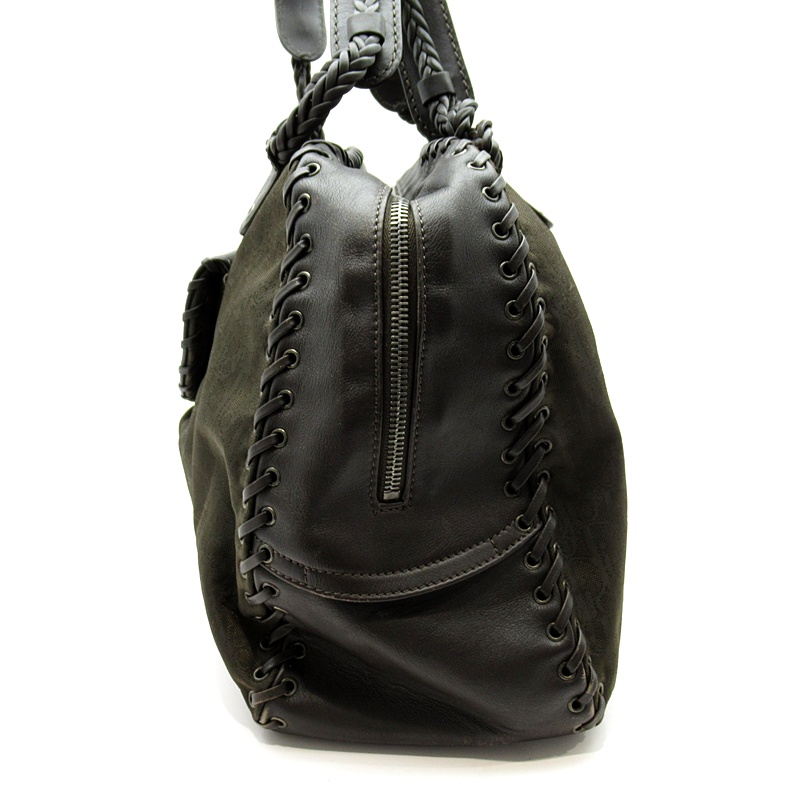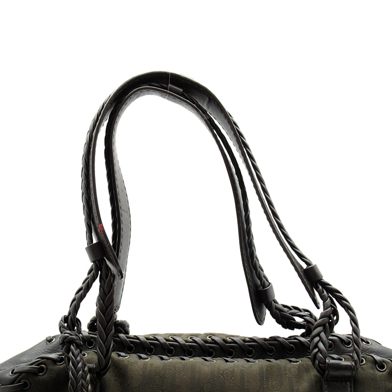 多少使用感有。角擦れがあります。表面レザー部分に擦り傷、シワ、汚れがあります。表面に一部とハンドル、底面の編み上げ部分に赤い汚れがあります。