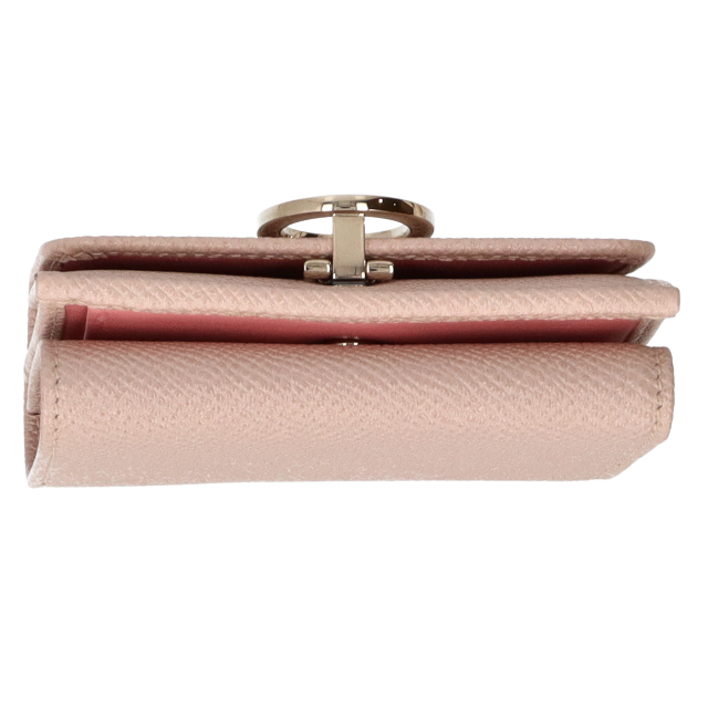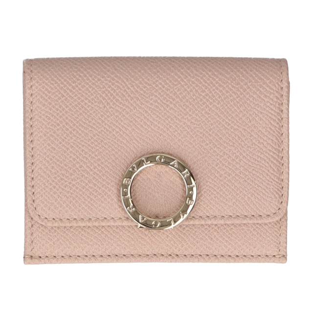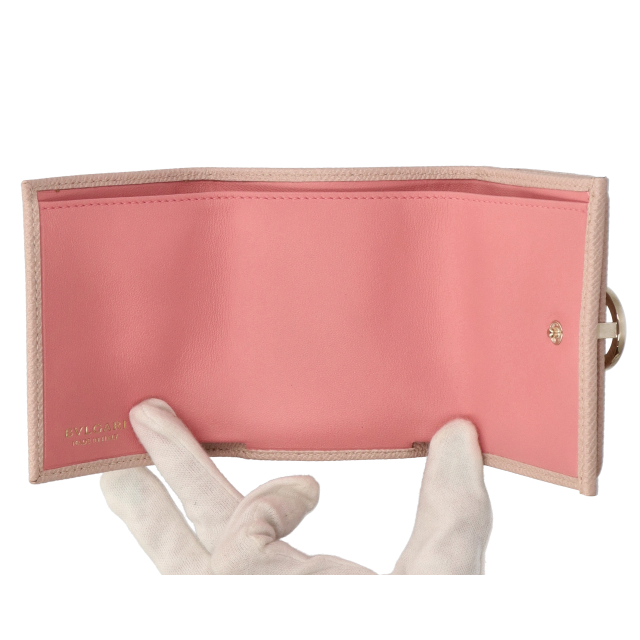 USED品。「BVLGARI BVLGARI(ブルガリ・ブルガリ)」コンパクトウォレット。BVLGARIを代表するアイコンデザイン、象徴的なダブルロゴのクロージャーをあしらった「BVLGARI BVLGARI」のコンパクトウォレット。本作は鮮やかなクリスタルローズのグレインカーフレザーとキャンディクォーツのナッパレザーを使用したラグジュアリーなアイテム。爽やかで落ち着いた上品さを漂わせます。