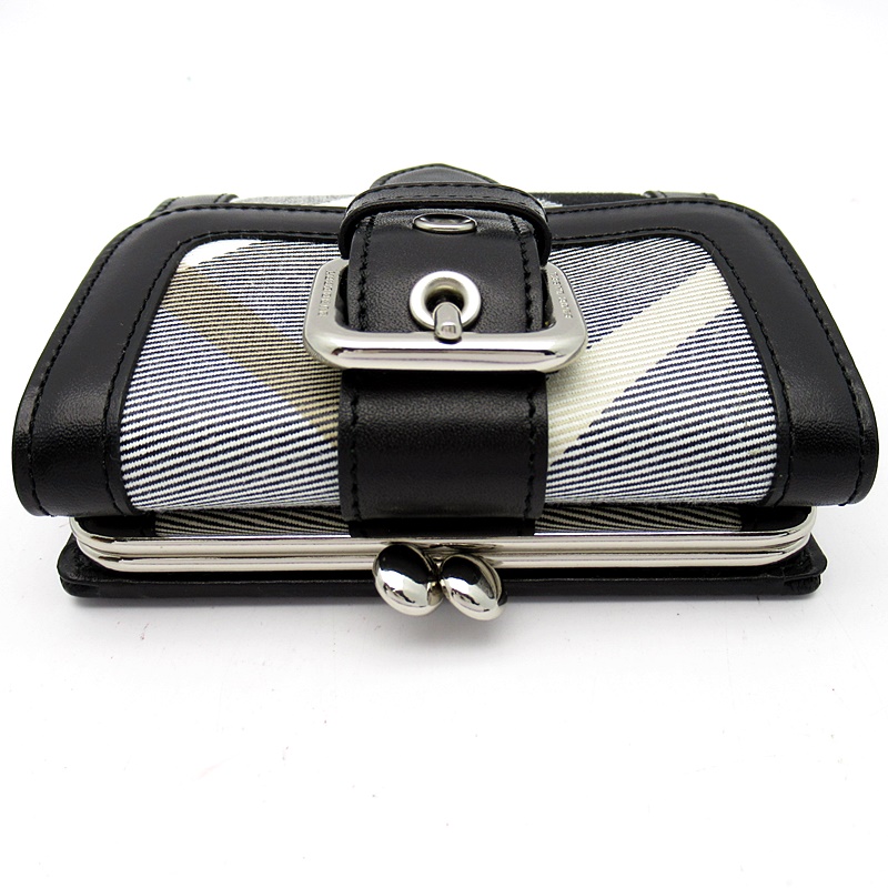 USED品。ブルーレーベルのがま口財布です。ベルト付きの人気のデザインで、存在感や高級感があります。