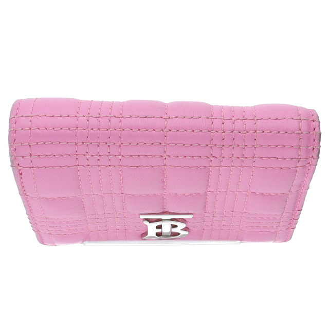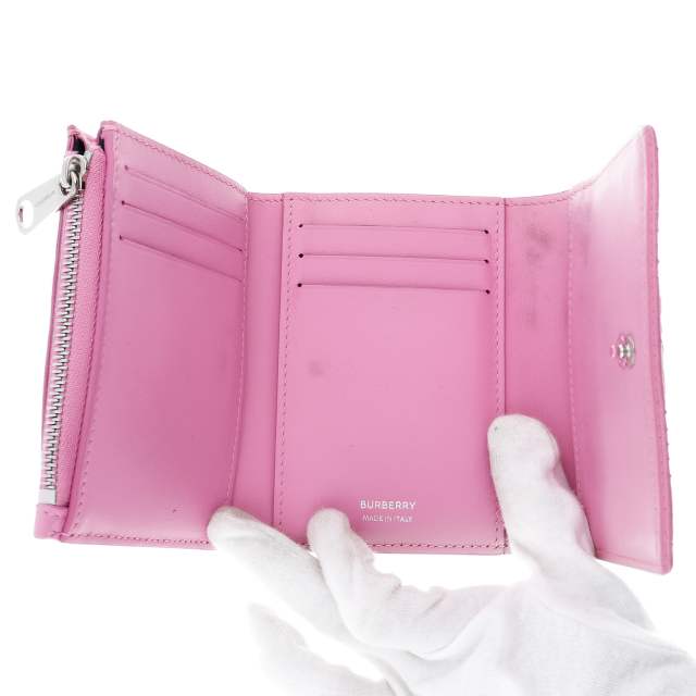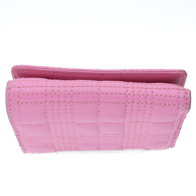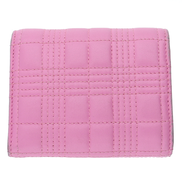 USED品。かわいらしいピンクのラムスキンをキルティング風にアレンジしたデザインです。正面のTBロゴがワンポイントになっていておしゃれな三つ折り財布。