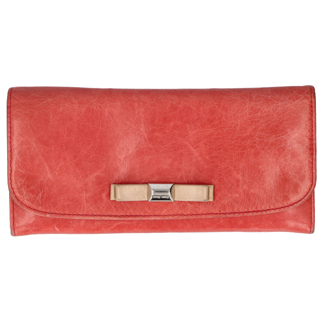 USED品。高級感あるレザーにMIUMIUのロゴがついた、キュートでオシャレな長財布です。質感が柔らかいので、手に馴染みやすいです。