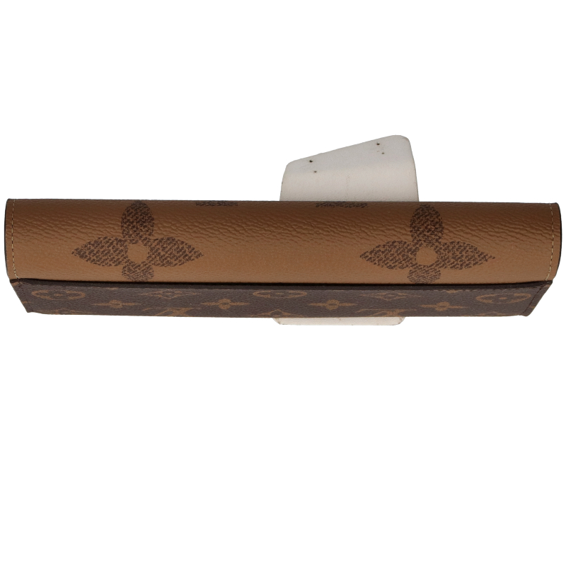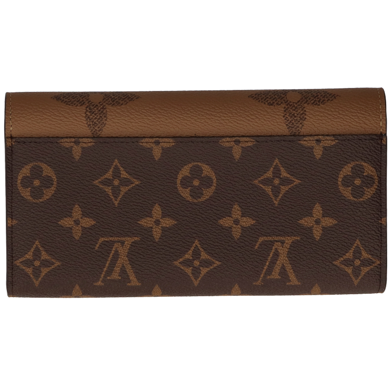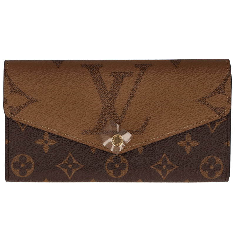 新品。モノグラム・キャンバスとモノグラム・ジャイアント リバース キャンバスのエレガントな組み合わせで再解釈された「ポルトフォイユ・サラ」。クラシカルな長方形の財布は、整理しやすい内装と豊富なポケットやカードスロットが魅力です。