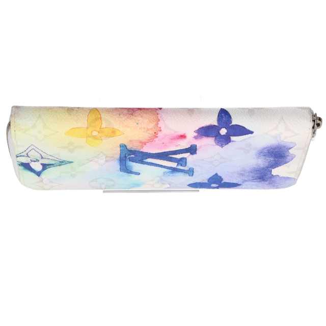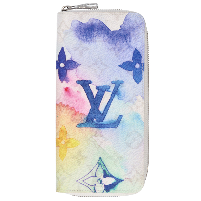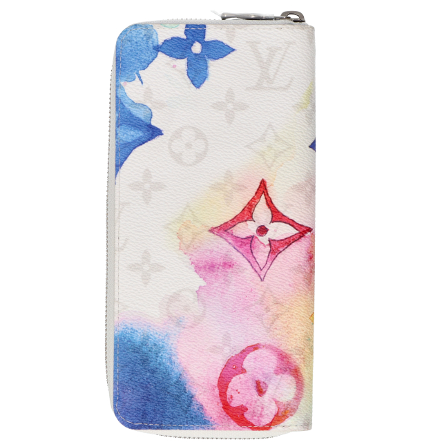 USED品。廃盤品。ルイヴィトンのマルチカラーのウォーターカラー・モノグラム キャンバスで仕立てた「ジッピーウォレット・ヴェルティカル」。滲んだようなパステル調のモノグラム・パターンをあしらいました。14個のカードスロットに加え、紙幣やコイン、領収書を収納できるポケットやコンパートメントを多数備えた機能的な内装デザインも魅力です。