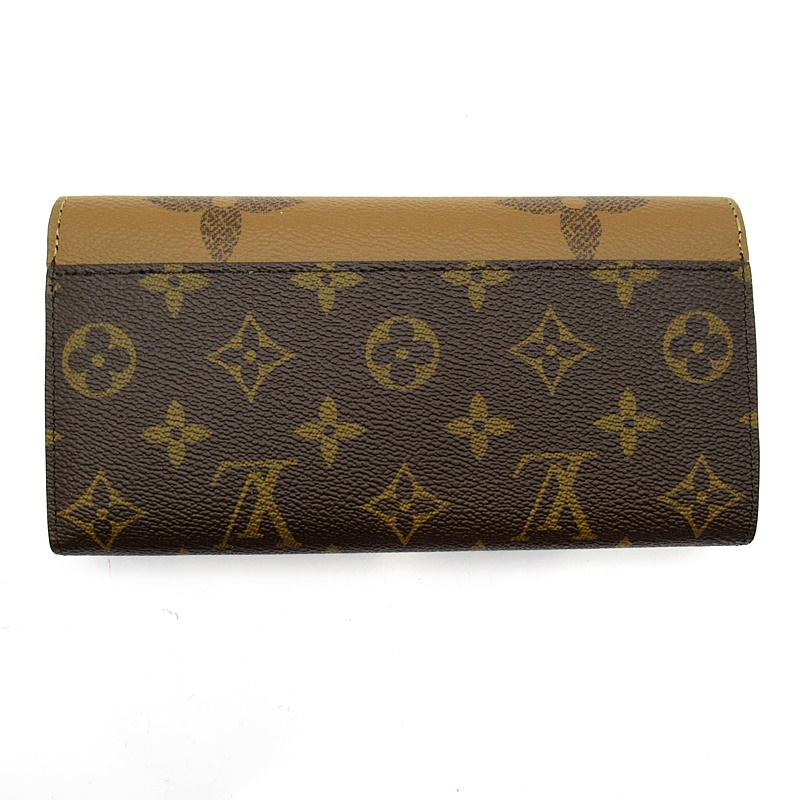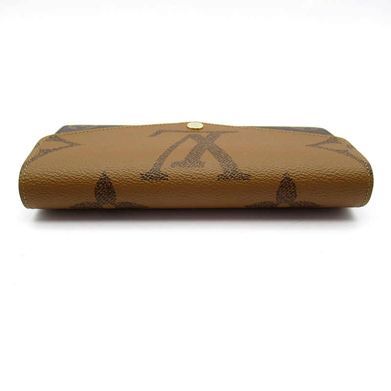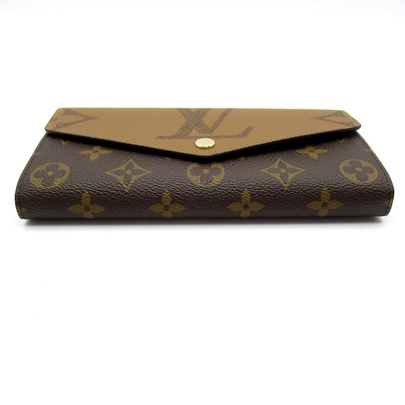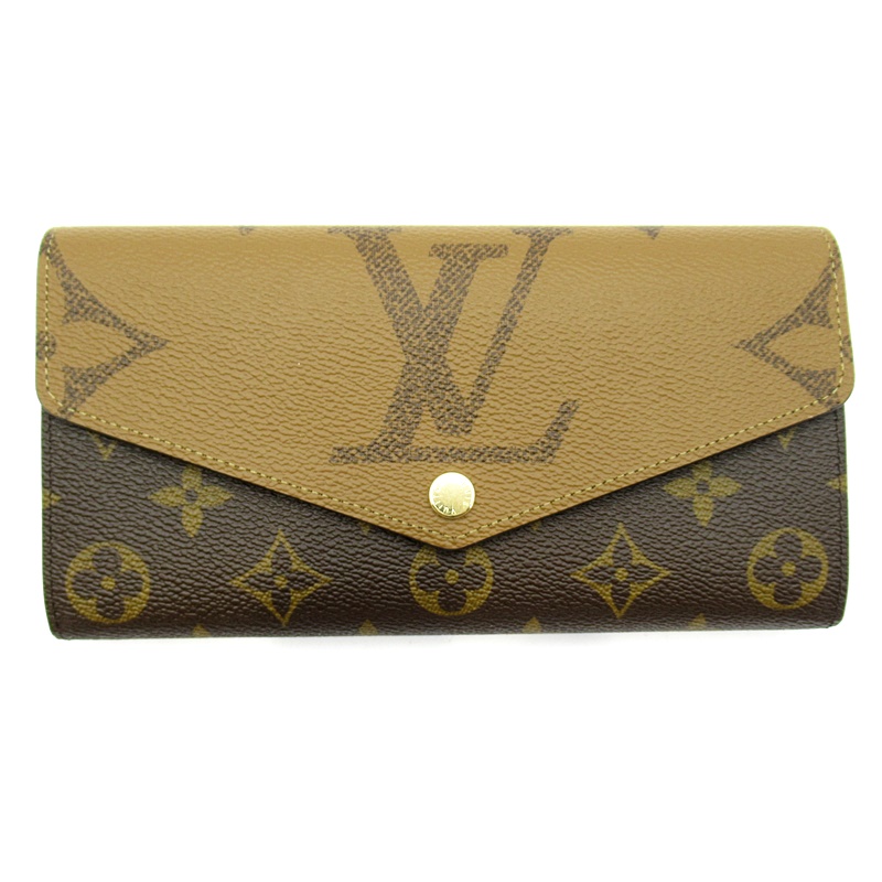 新品。モノグラム・キャンバスとモノグラム・ジャイアント リバース キャンバスのエレガントな組み合わせで再解釈された「ポルトフォイユ・サラ」。クラシカルな長方形の財布は、整理しやすい内装と豊富なポケットやカードスロットが魅力です。