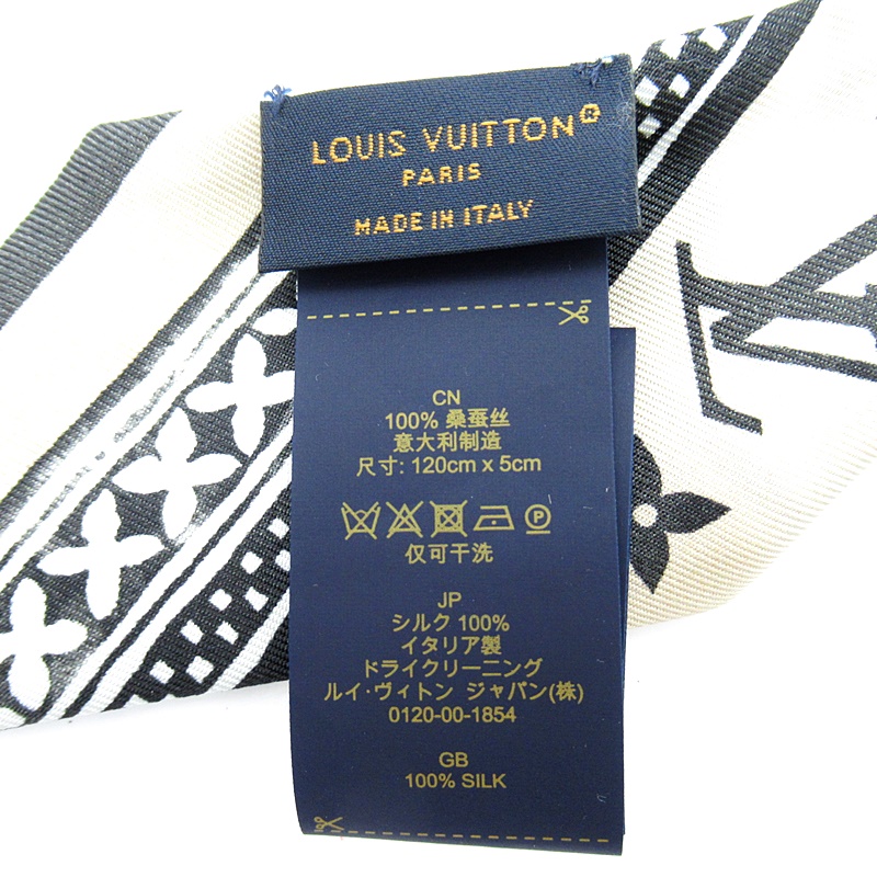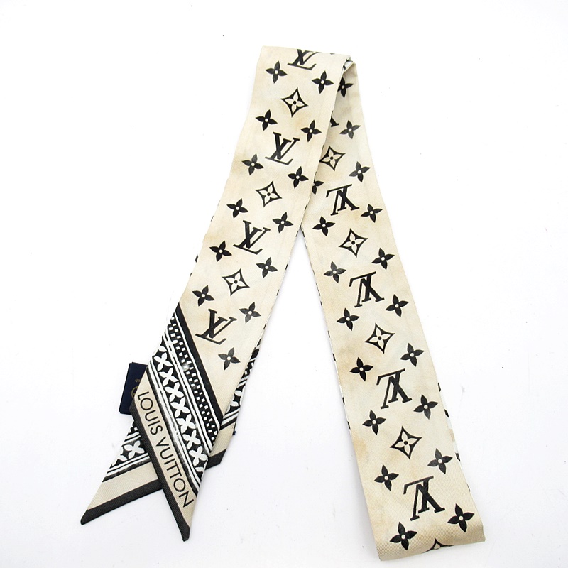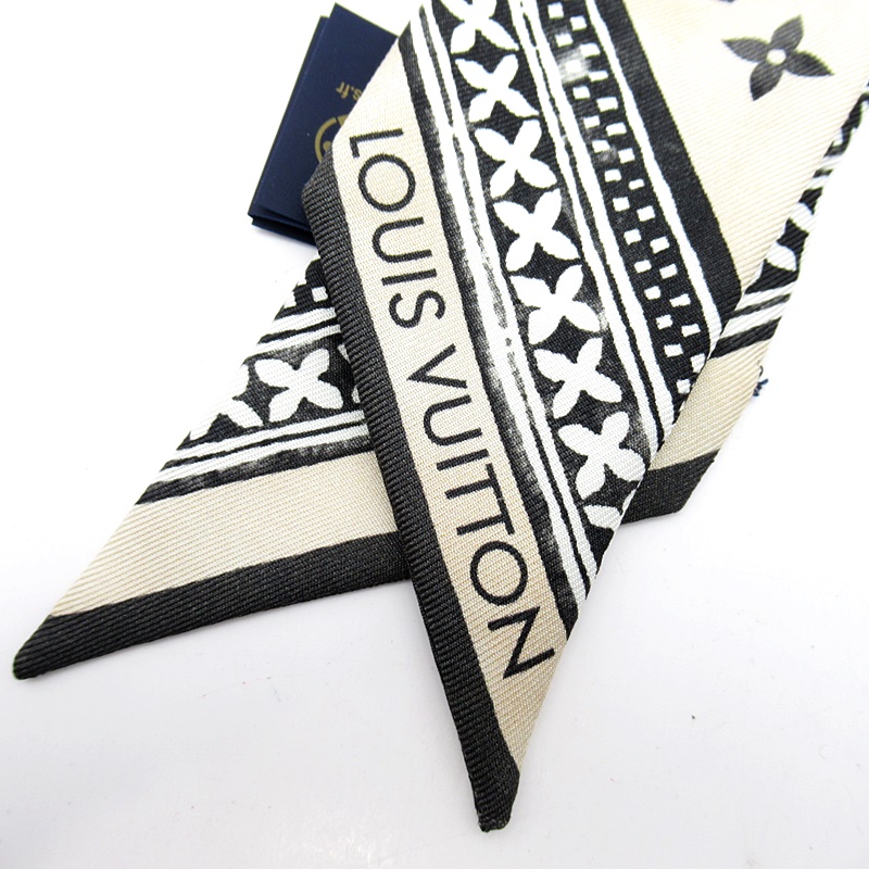 USED品。ルイ・ヴィトンの可愛いスカーフ「バンドー」。シルク100%の素材に、ルイ・ヴィトンで人気の柄が描かれたスカーフです。身に付けるだけでなく、バッグに付けても可愛らしいお品物です。