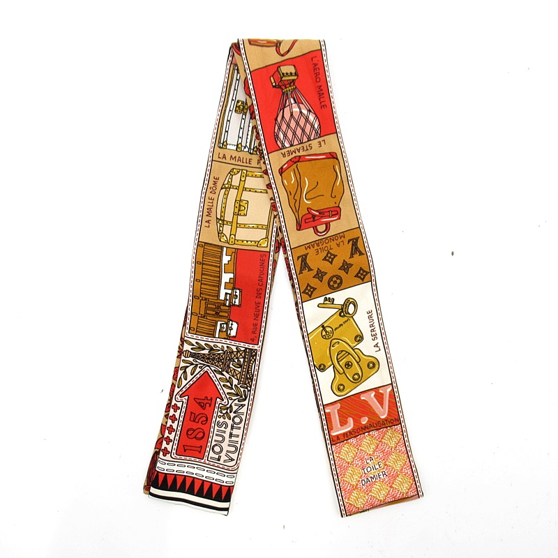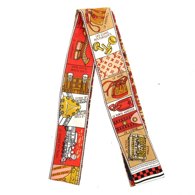 USED品。ルイ・ヴィトンの可愛いスカーフ「バンドー」。シルク100%の素材に、ルイヴィトンで人気のバッグや小物類が描かれたスカーフです。身に付けるだけでなく、バッグに付けても可愛らしいお品物です。
