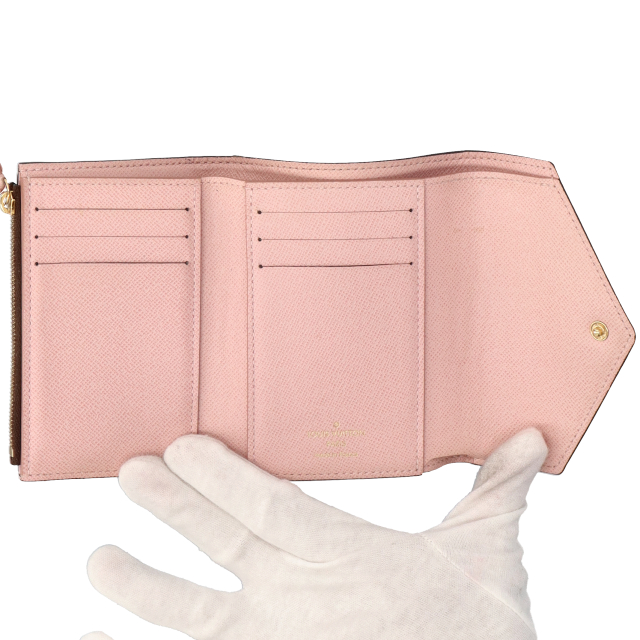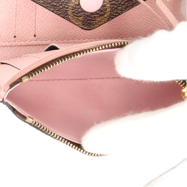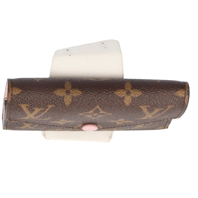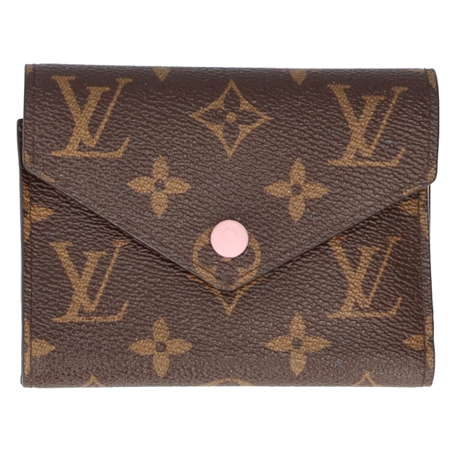 USED品。ホックタイプの折財布。モノグラムのきれいな雰囲気と差し色のピンクのカラーリングがとても良く普段遣いにもぴったりです。