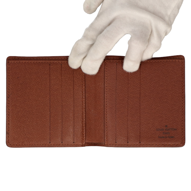 USED品。コンパクトなデザインでバッグやポケットにスマートに収まる二つ折り札入れ。クレジットカードを6枚収納可能。