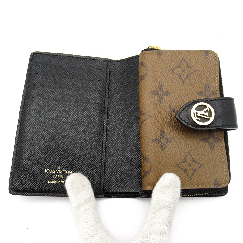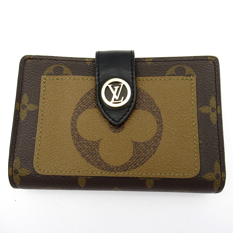 USED品。特徴的なモノグラム・ジャイアント リバース キャンバスのフロントポケットをあしらった「ポルトフォイユ・ジュリエット」。使いやすいミディアムサイズのデザインに4つのカードスロット、紙幣用ポケット、ファスナー付きのコイン用コンパートメントを備え、機能性も抜群です。