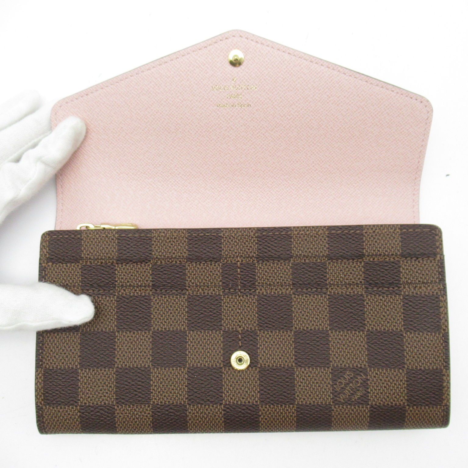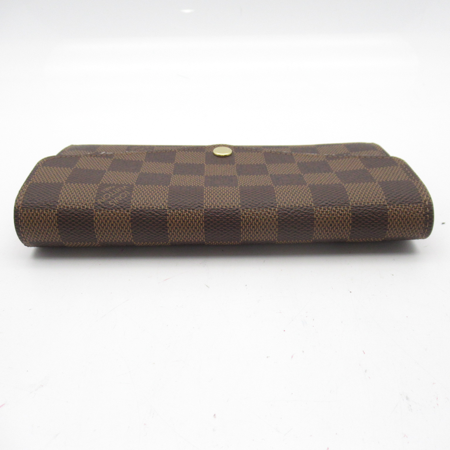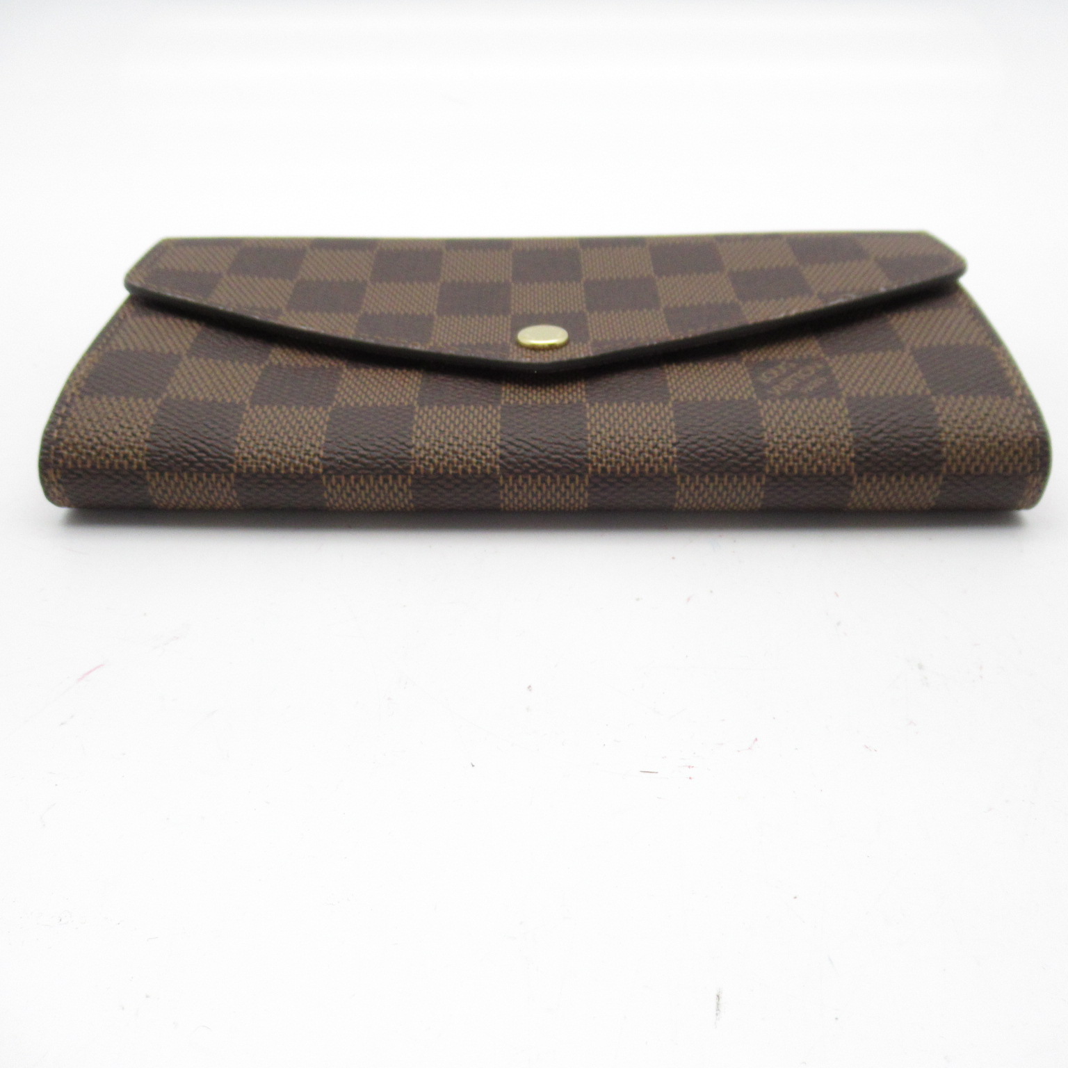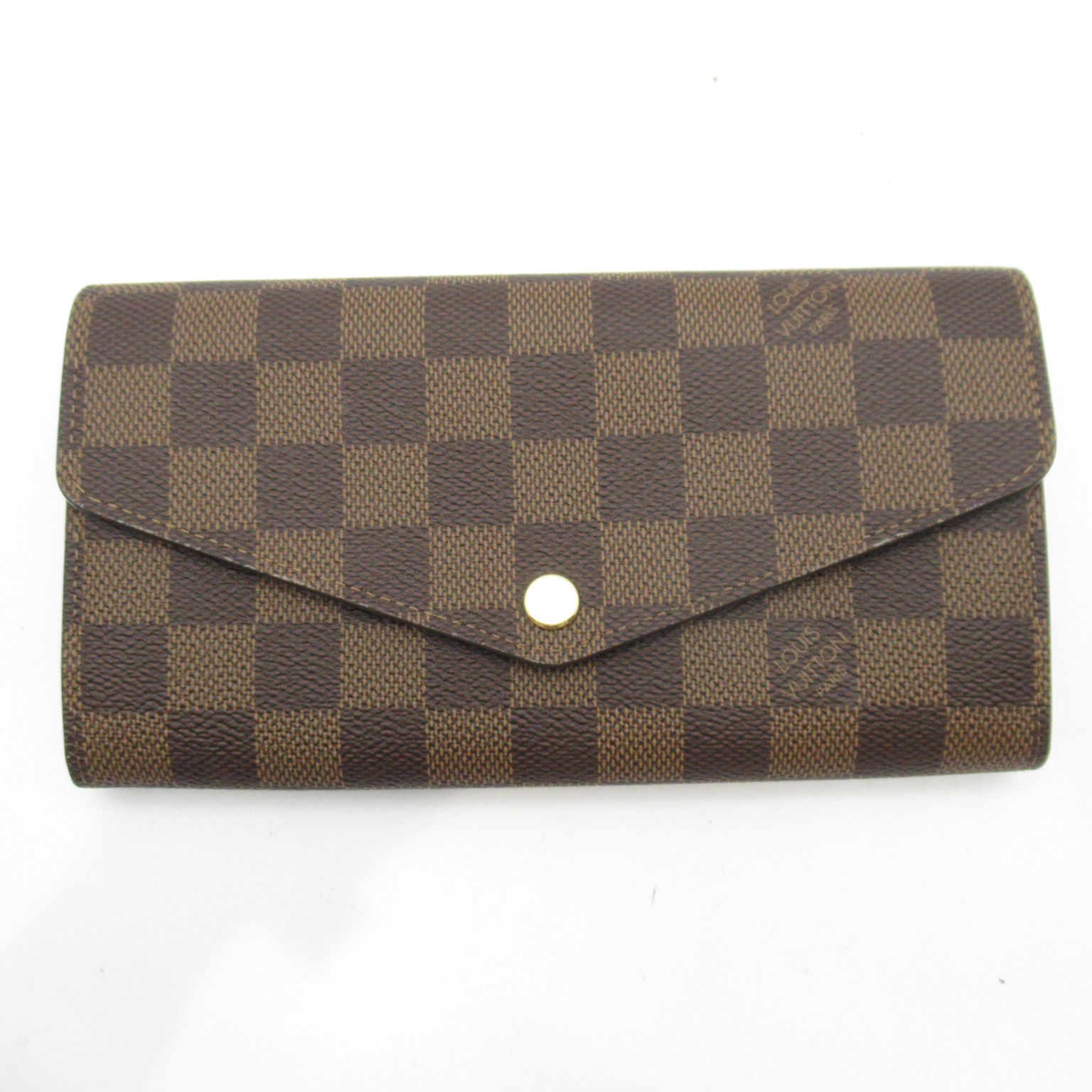 USED品。ルイ・ヴィトンの伝統的なダミエ・キャンバスにグレインレザーのライニングを合わせたポルトフォイユ・サラ」。2つの充分な容量のコンパートメント、ファスナー付きコインポケット、複数のカードスロットを備えた機能性と、フェミニンな印象を併せ持つ定番アイテムです。エンヴェロップ型のフラップには、刻印を施したゴールドカラーのスナップをあしらいました。