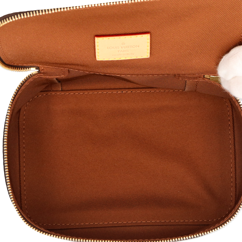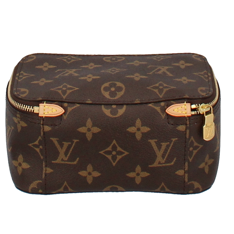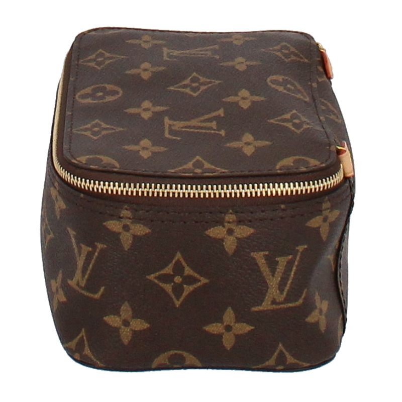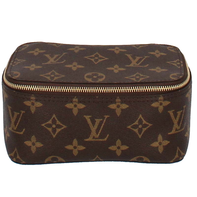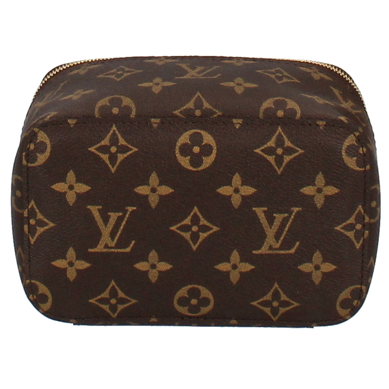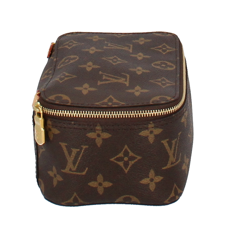 USED品。モノグラム・キャンバスにヌメ革のトリミングを施した「キューブ・ドゥ・ランジュモン PM」。ルイ・ヴィトンの最新のパッキング技術にオマージュを捧げたアクセサリーを収納するのに最適なサイズで、ストールやバンダナ、ネクタイ、下着などをすっきりと収納します。ラゲージ内に整理してパッキングできるデザインでありながら、旅先ではラゲージから取り出し、そのままクローゼットや棚に置いてお使いいただけます。