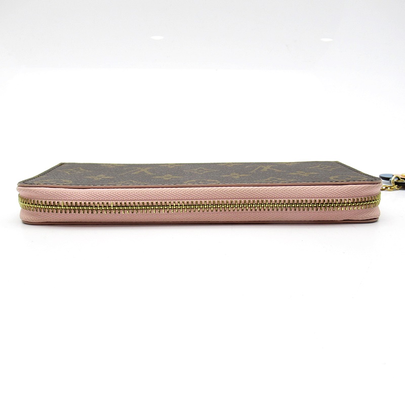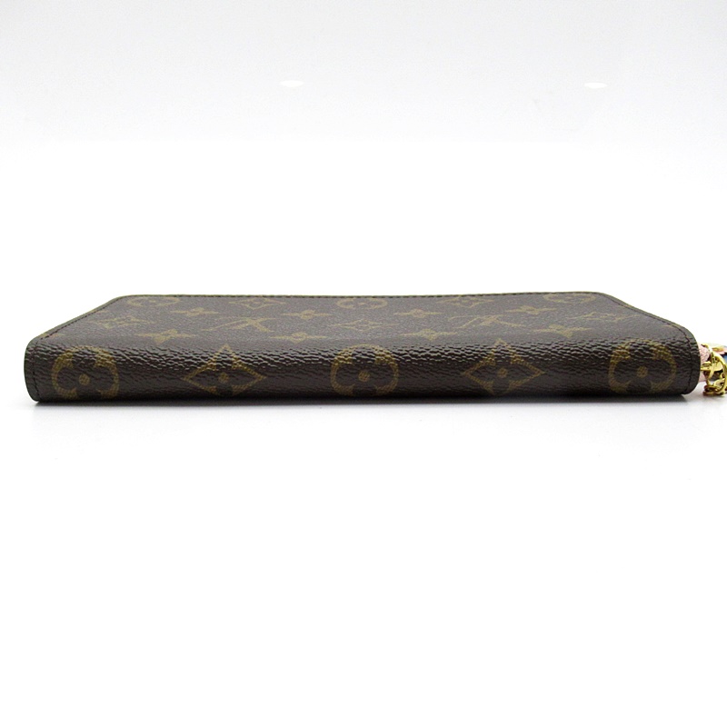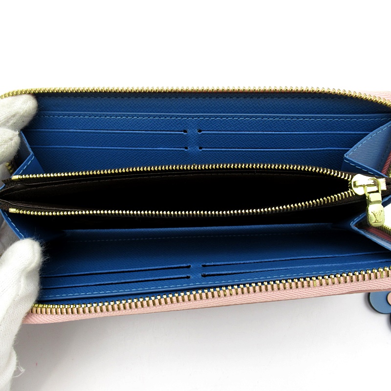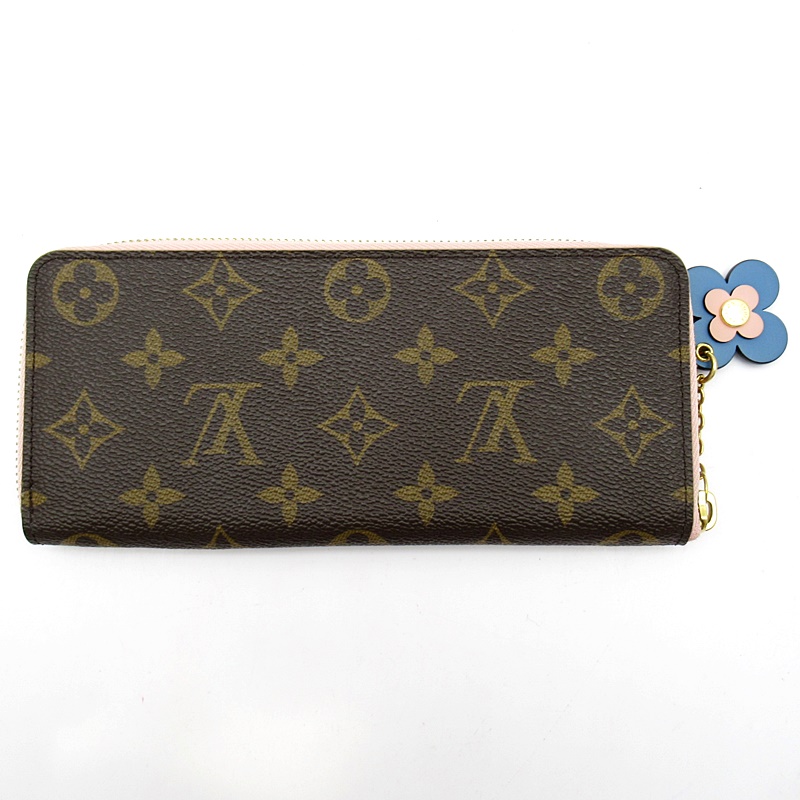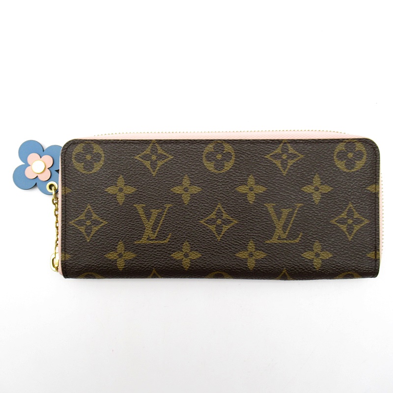 USED品。廃盤品。コンパクトながらも収納力抜群なスマートで機能的なモノグラム・キャンバスの財布「ポルトフォイユ・クレマンス」。ブルーのレザートリミングとキュートなモノグラムフラワーのチャームが華やかなデザインです。