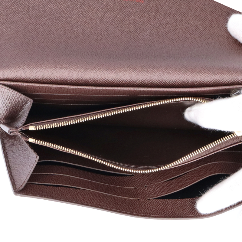 新品。ルイ・ヴィトンの伝統的なダミエ・キャンバスにグレインレザーのライニングを合わせたポルトフォイユ・サラ」。2つの充分な容量のコンパートメント、ファスナー付きコインポケット、複数のカードスロットを備えた機能性と、フェミニンな印象を併せ持つ定番アイテムです。