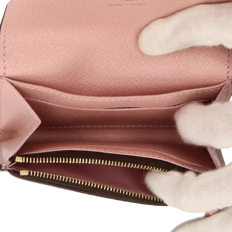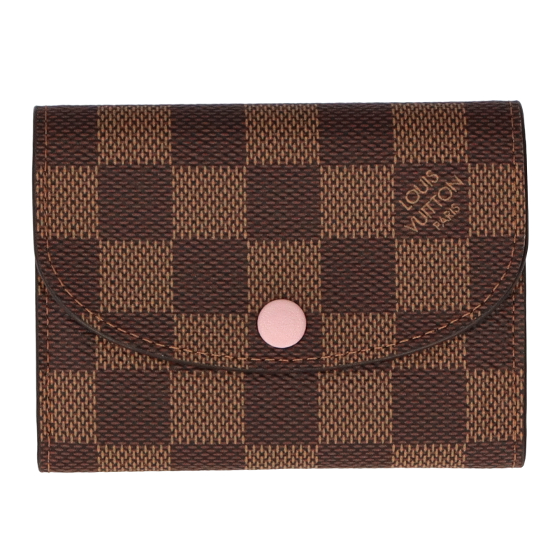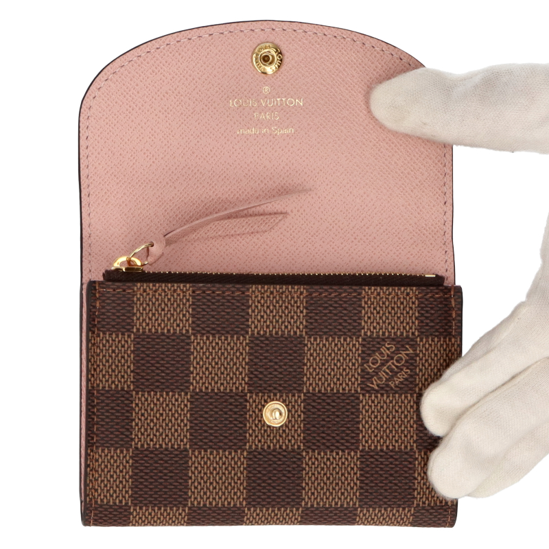 USED品。ダミエ・キャンバスにカラフルなグレインカーフレザーを合わせた「ポルトモネ・ロザリ」。愛らしいフェミニンなデザインが魅力です。バッグやポケットにもすっきりと入るミニサイズでありながら、驚くほどの収納力を備えています。特徴的なエンヴェロップ型のフラップには、スナップをあしらいました。※本製品は製造時期によりスナップボタンの素材・カラーが異なります。