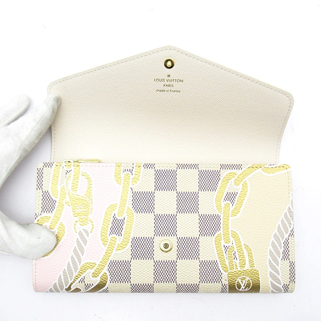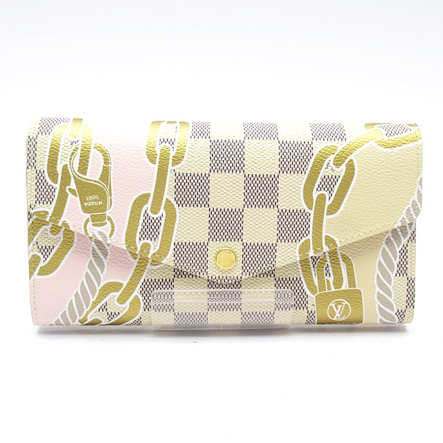 新品。リゾート感溢れるダミエ・アズール キャンバスをアップデートして仕立てた「ポルトフォイユ・サラ NM」。ロープとチェーンで表現した、柔らかなベージュ & ピンクのマリンスタイルのパターンが、キャンバスに個性を添えます。カードスロットやファスナー付きコインポケットなどを備えた、スマートな内装デザインが魅力です。