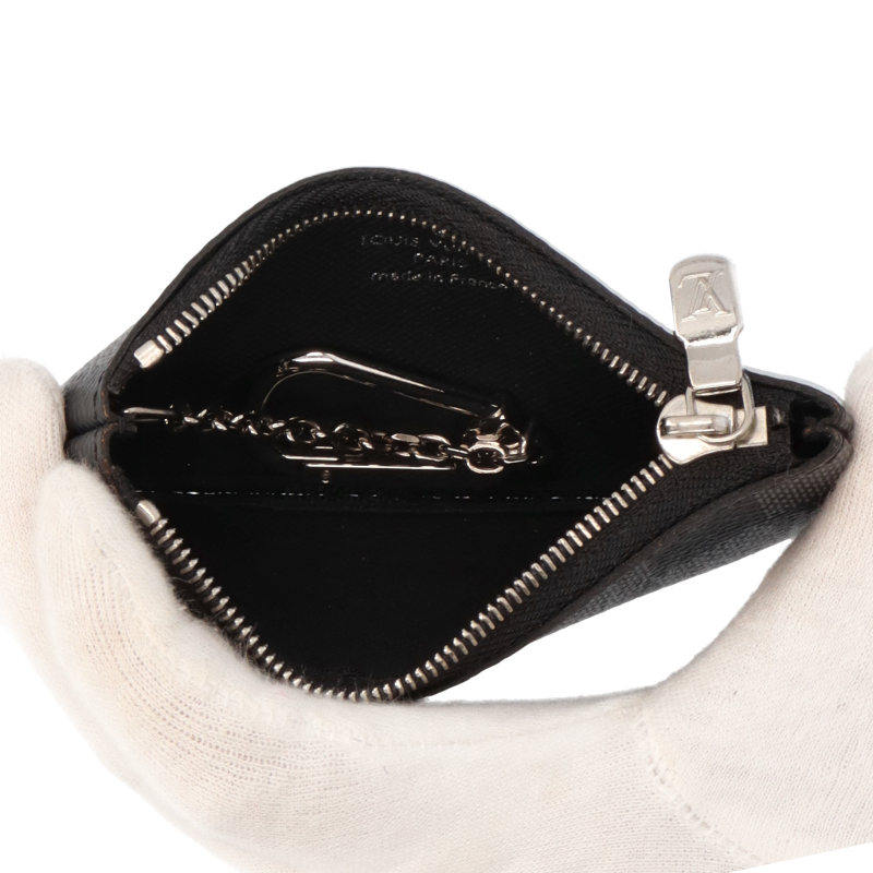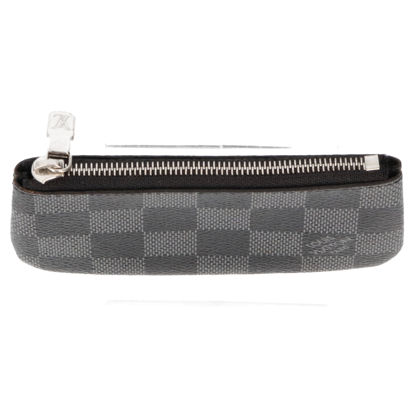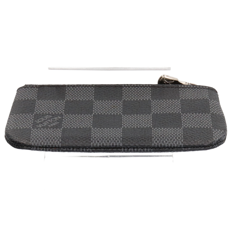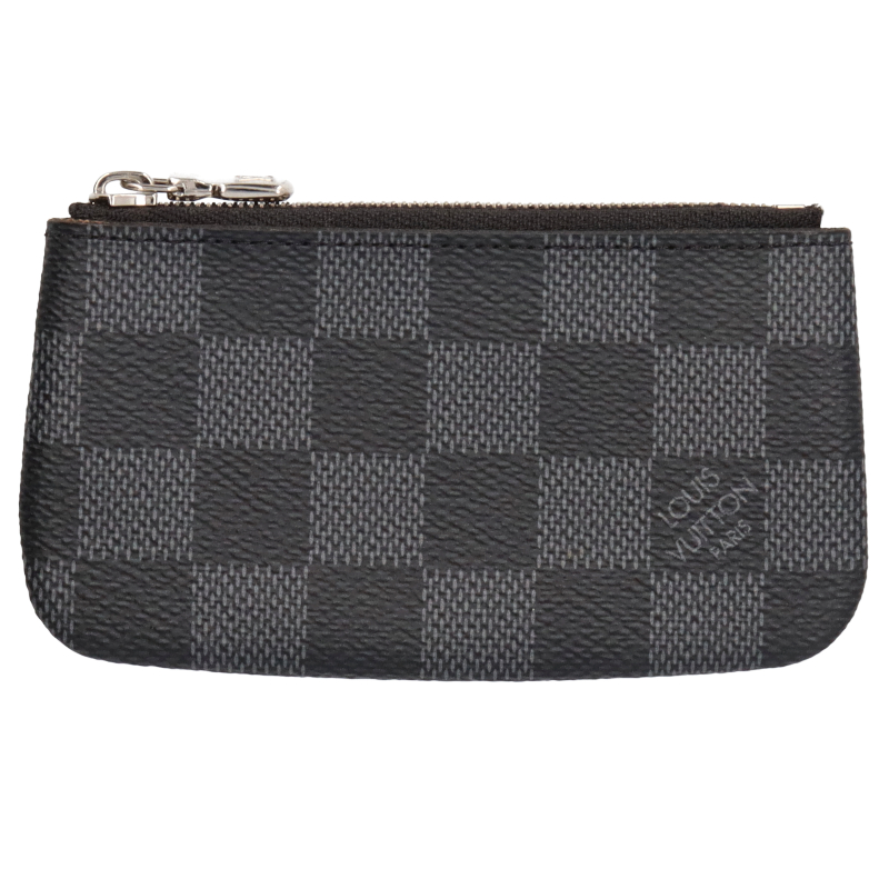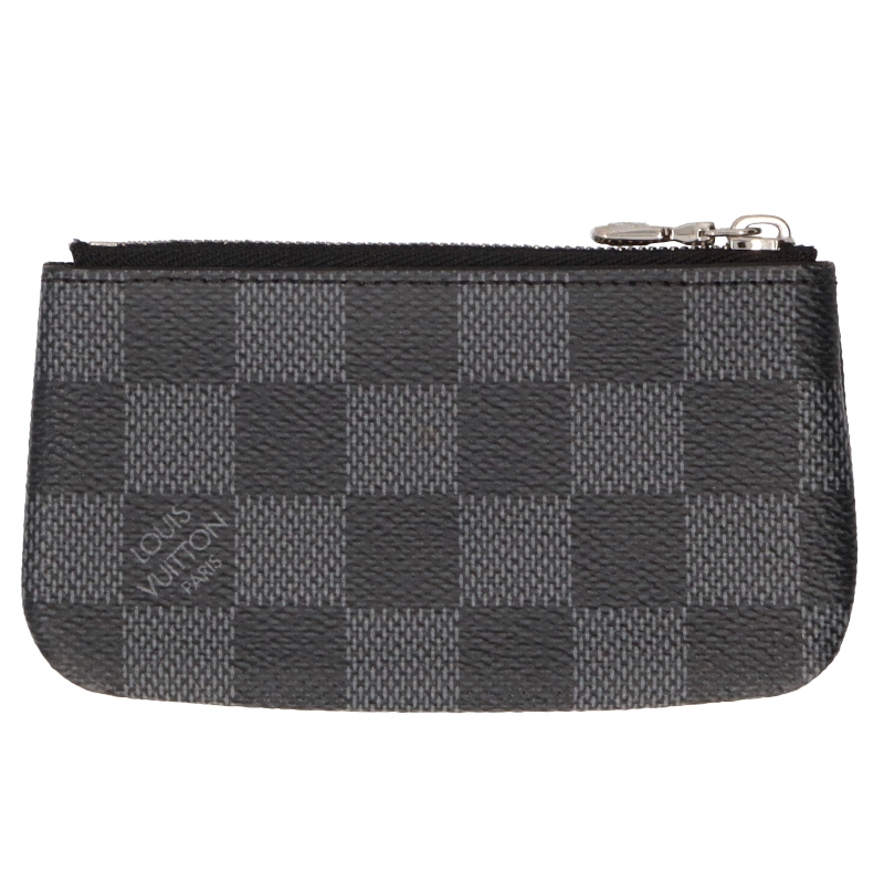 USED品。アイコニックなブラックとグレーのダミエ・グラフィット キャンバスに、シルバーカラーのメタルのファスナー、チェーン、キーホルダーを組み合わせた「ポシェット・クレ」。機能的かつエレガントなアクセサリーです。