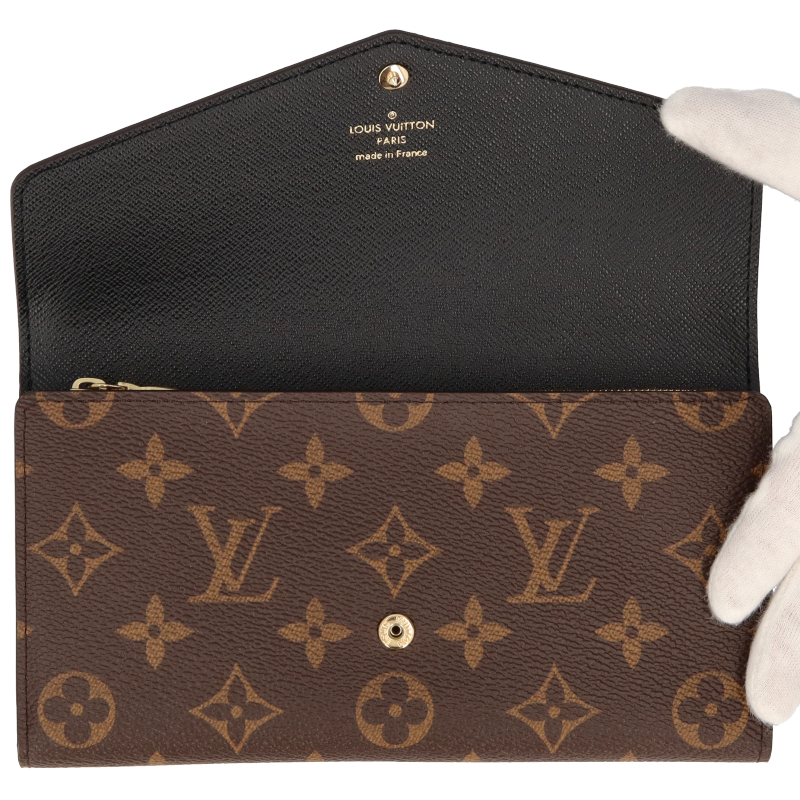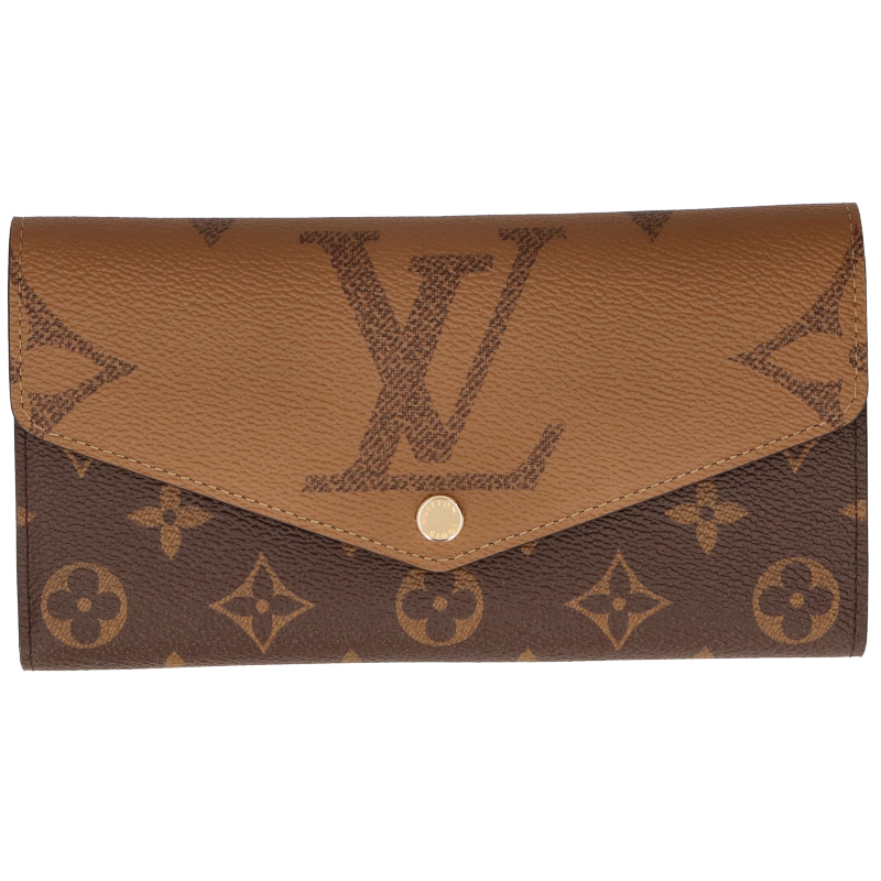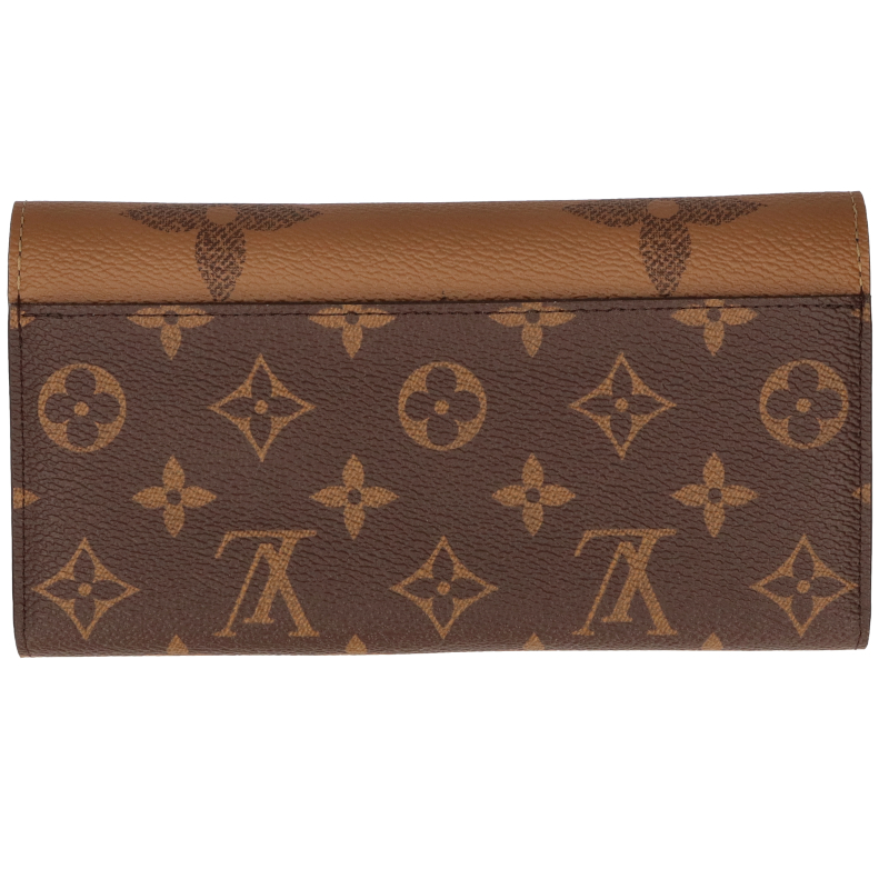 新品。モノグラム・キャンバスとモノグラム・ジャイアント リバース キャンバスのエレガントな組み合わせで再解釈された「ポルトフォイユ・サラ」。クラシカルな長方形の財布は、整理しやすい内装と豊富なポケットやカードスロットが魅力です。