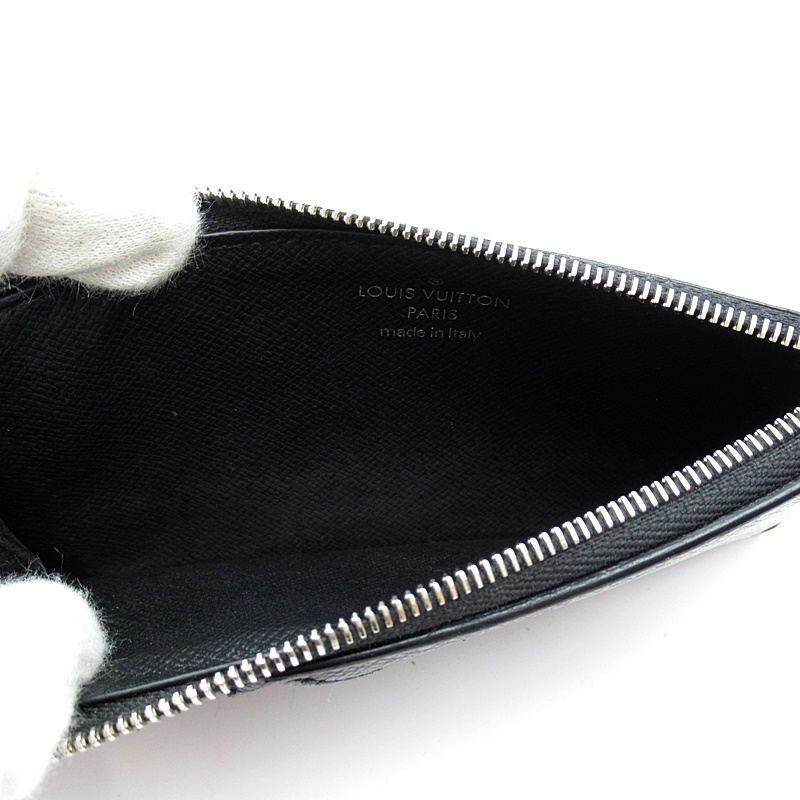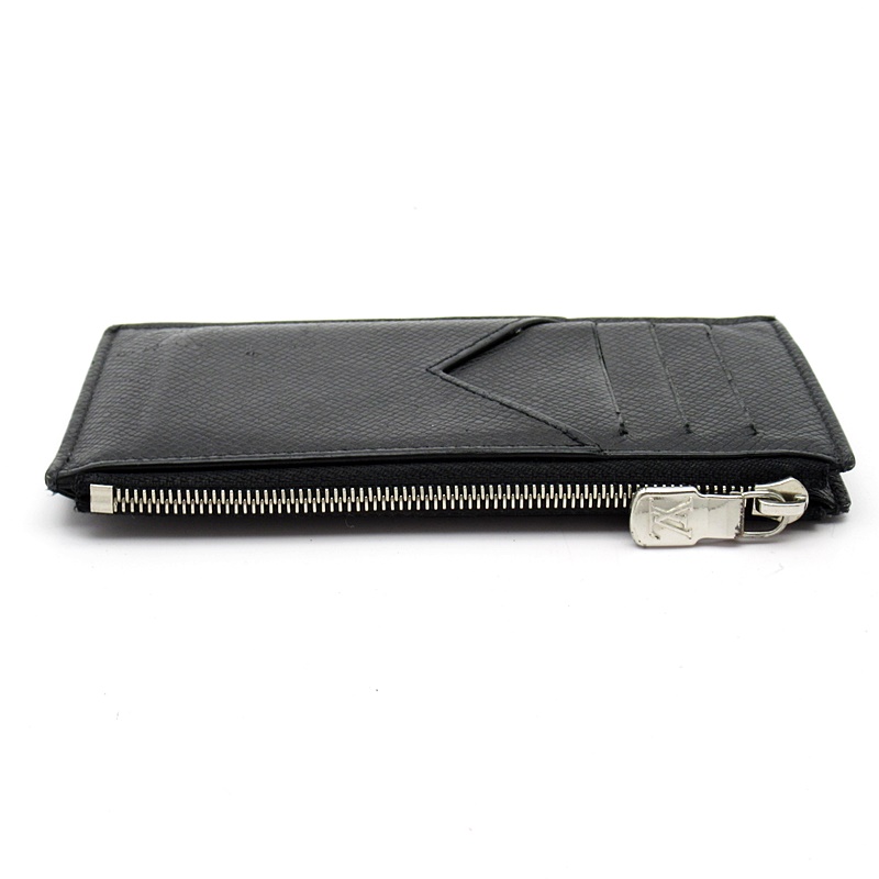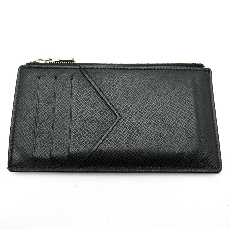USED品。ルイ・ヴィトンのシグネチャーであるブラックのタイガ・レザーを使用した「コインカード・ホルダー」。支払いの際の必需品を1つにまとめて安全に収納できるすっきりとしたスリムなデザイン。複数のクレジットカード用スロット、紙幣用コンパートメントに、シルバーカラーの引き手が付いたファスナー式コインケースを備えています。