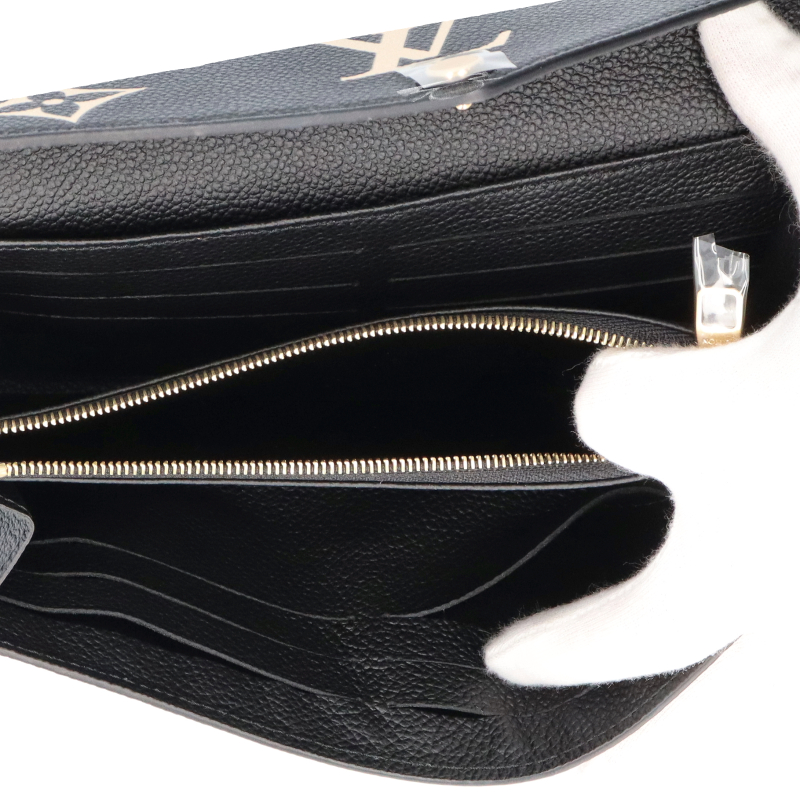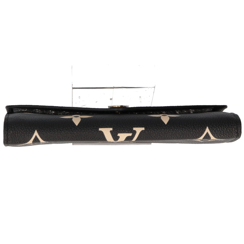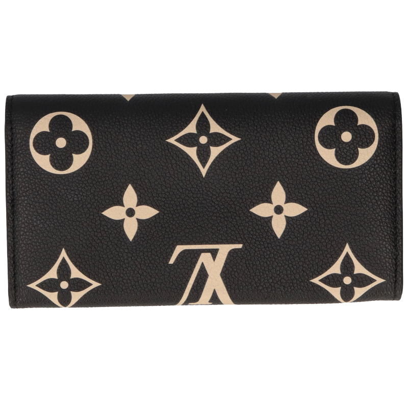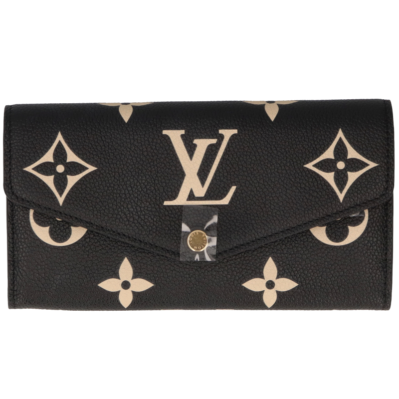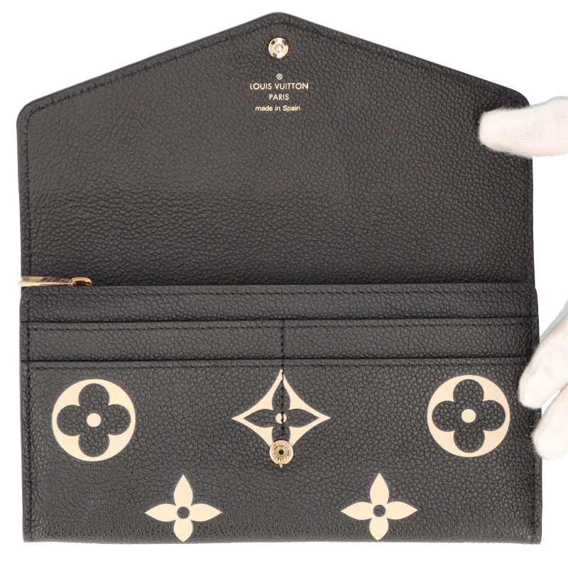 新品。モノグラム・パターンのエンボス加工が美しいバイカラーのモノグラム・アンプラント レザーでエレガントに仕上げた「ポルトフォイユ・サラ」。2つの大ぶりのコンパートメントに加え、16枚のカードを収納できるカードスロットや複数のポケットを備えています。