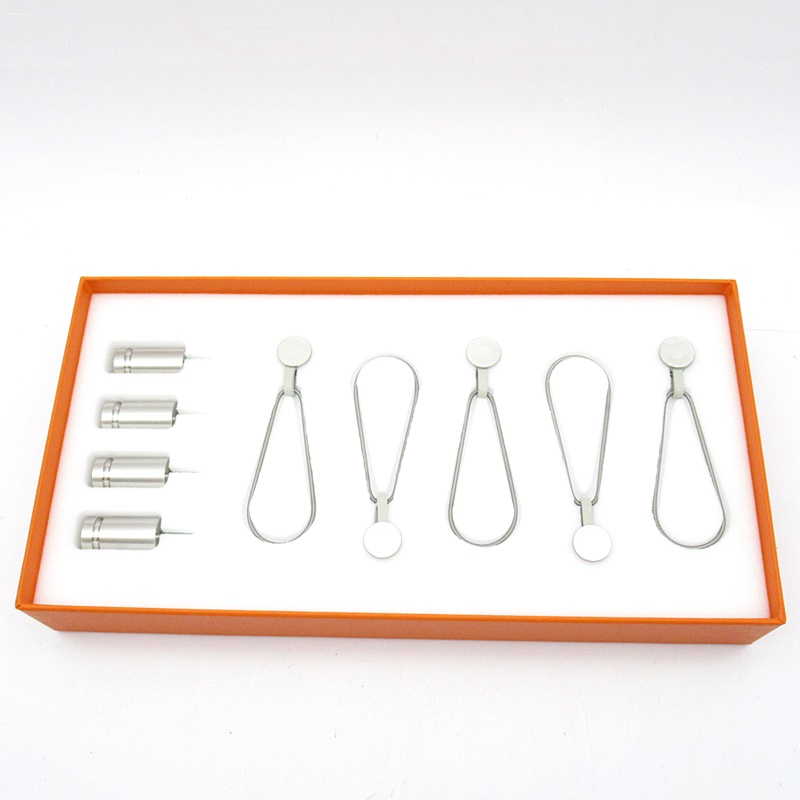 USED品。エルメスのカレ(スカーフ)を、自宅で絵画のように飾れる「ハンギングシステム」です。セリエモチーフのマグネットでカレの四隅を挟み、壁面に差し込んだスクリュー金具にマグネット部品のワイヤーフックを引っ掛け四方に引っ張り吊り下げるようにして展示します。額装と異なりカレを損傷することなく交換も簡単にできるので、気軽に差し替えて観賞用・着用と自由に楽しめます。
