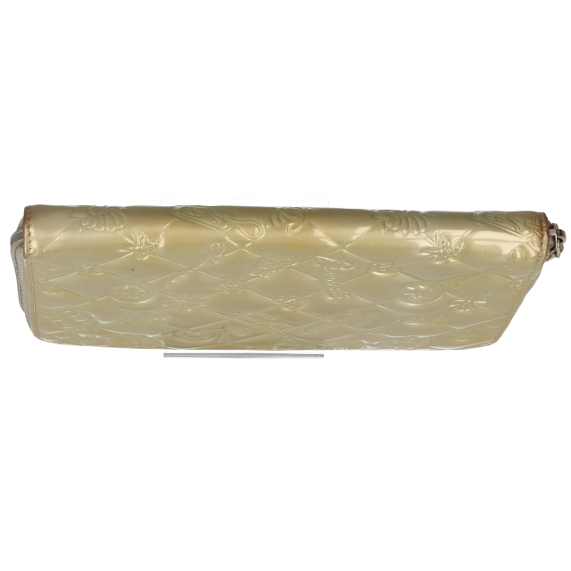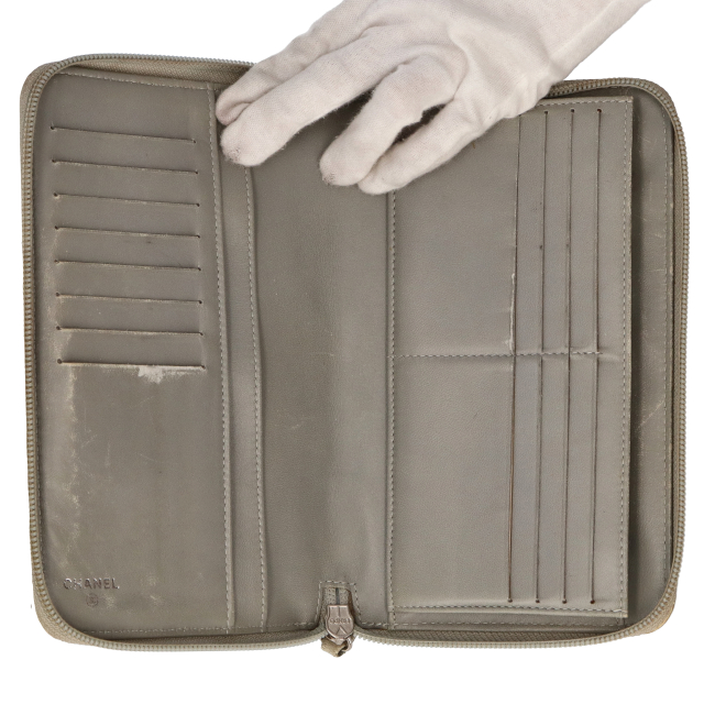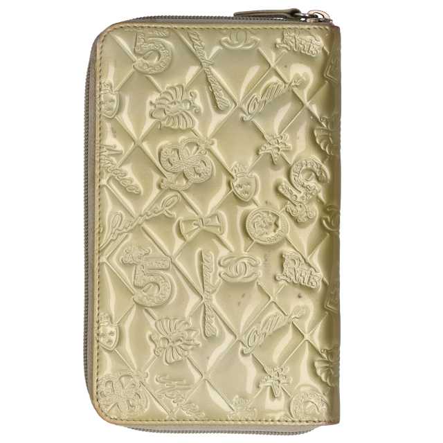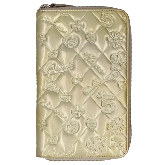 USED品。シャネルのココマークやコイン、No5など様々なロゴをあしらった型押しのデザインはシンプルかつ上品で多くの女性から支持されているデザインです。