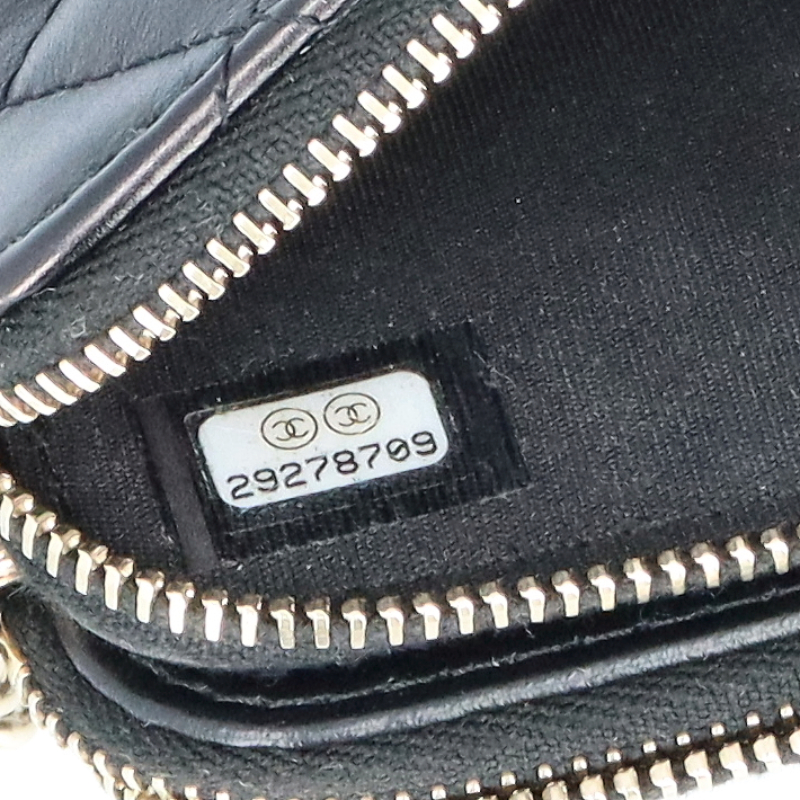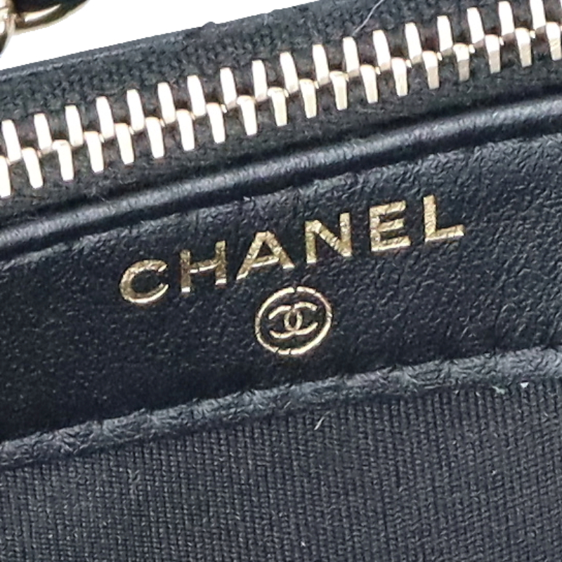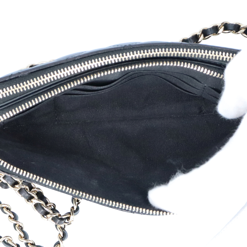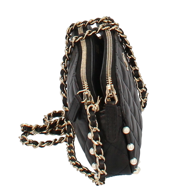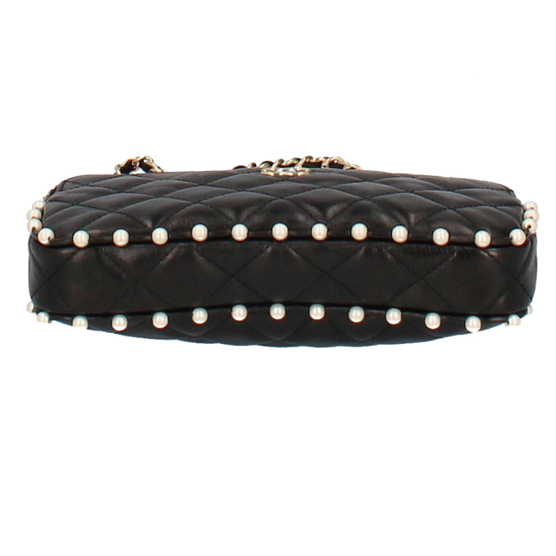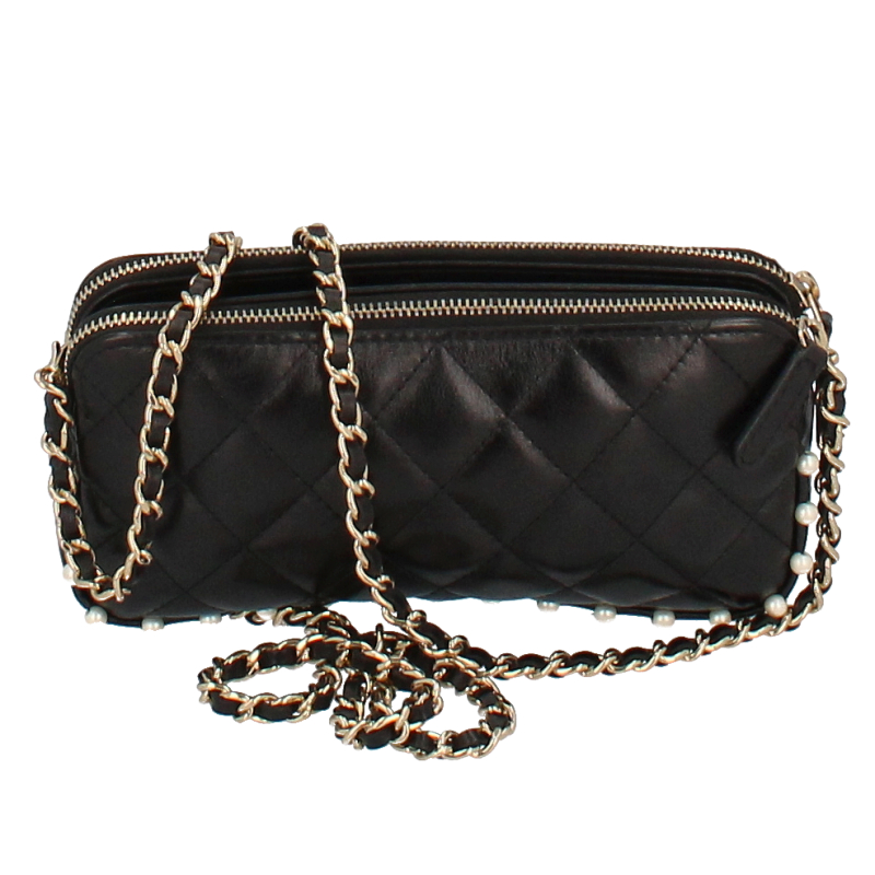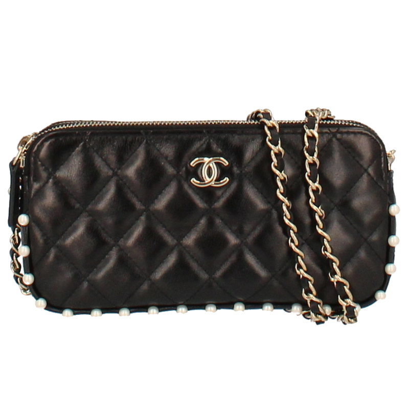 USED品。ゴールド金具。ラムスキンを使用したチェーンウォレットです。柔らかく、手触りのいいラムスキン素材にフェイクパールがあしらわれており、上品で高級感のある逸品です。