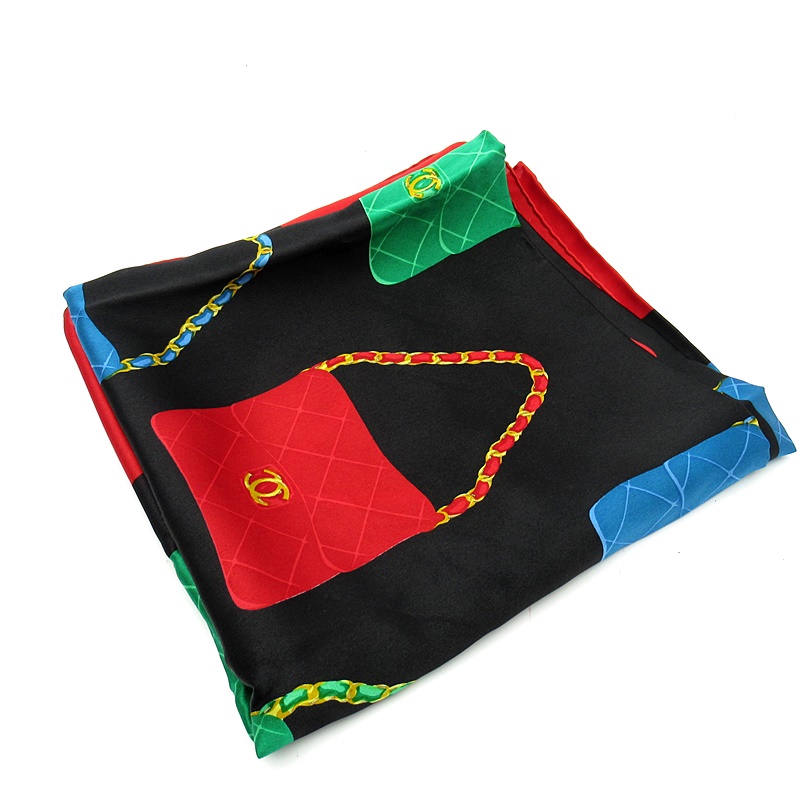 USED品。艶があり、滑らかでさらっとした手触りの上質なシルクスカーフ。様々なバックが描かれており、華やかなデザインになっております。