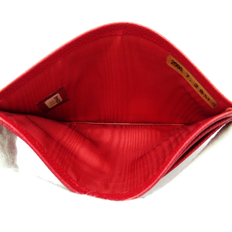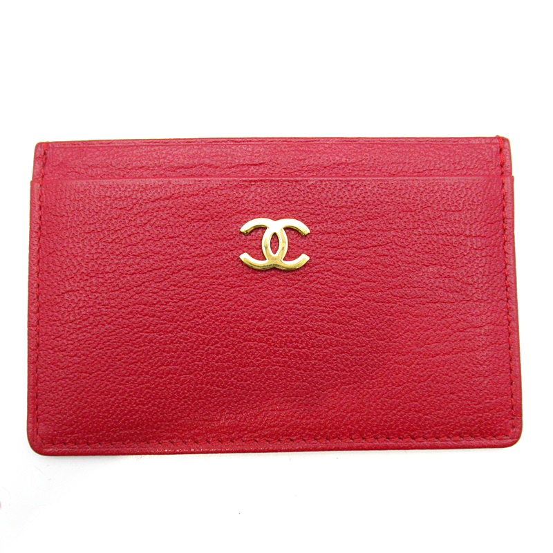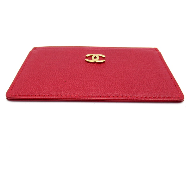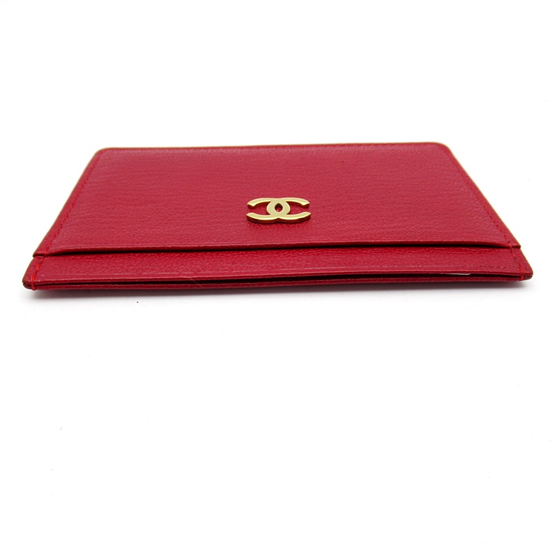 USED品。レッドカラーにゴールドのシャネルマークがついたカードケース。コンパクトで無駄のないデザインです。