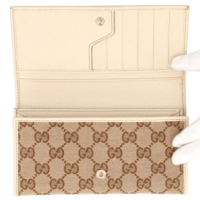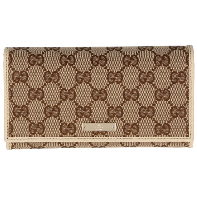 未使用品。グッチ王道人気のGGキャンバスと上質なレザーのコンビデザインが、シンプルながらも高級感溢れるお財布です。GUCCIのロゴプレートがアクセントになっています。スリムながらも収納力があり、デザイン性と機能性を兼ね備えています。