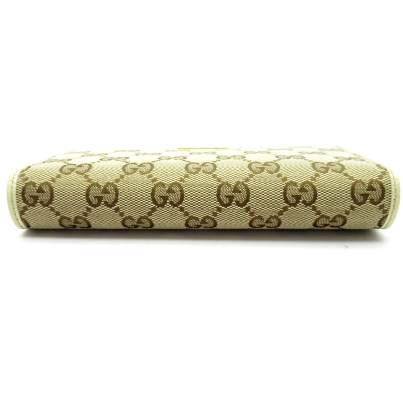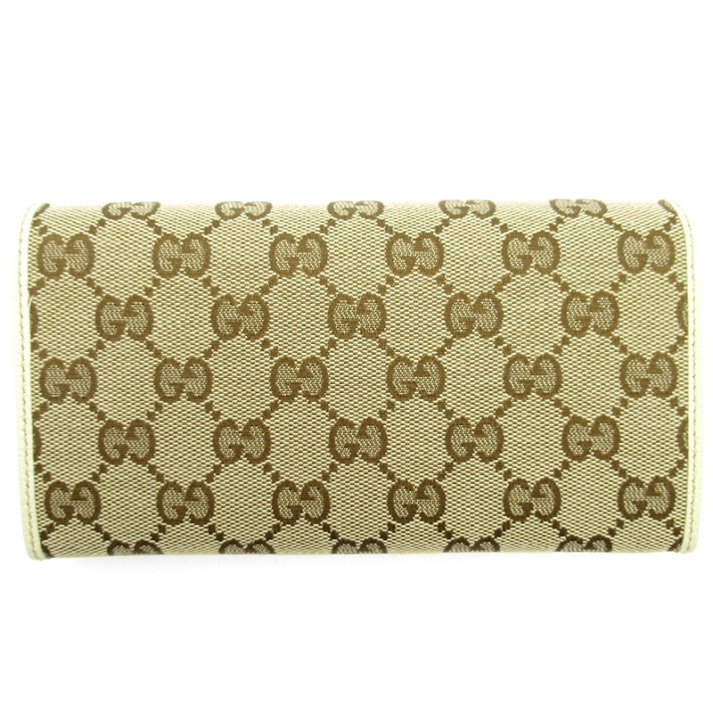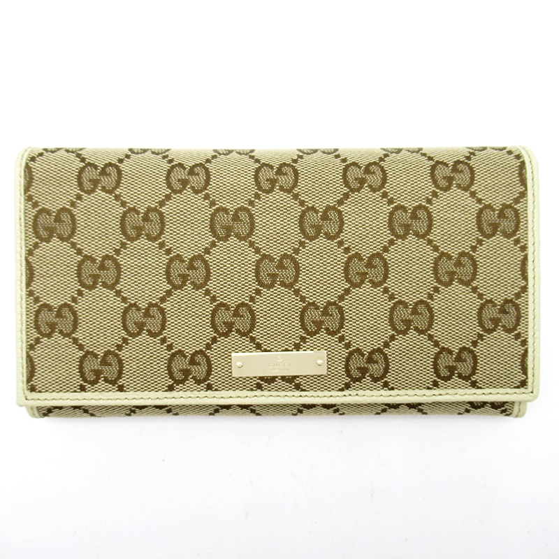 USED品。グッチ王道人気のGGキャンバスと上質なレザーのコンビデザインが、シンプルながらも高級感溢れるお財布です。GUCCIのロゴプレートがアクセントになっています。スリムながらも収納力があり、デザイン性と機能性を兼ね備えています。