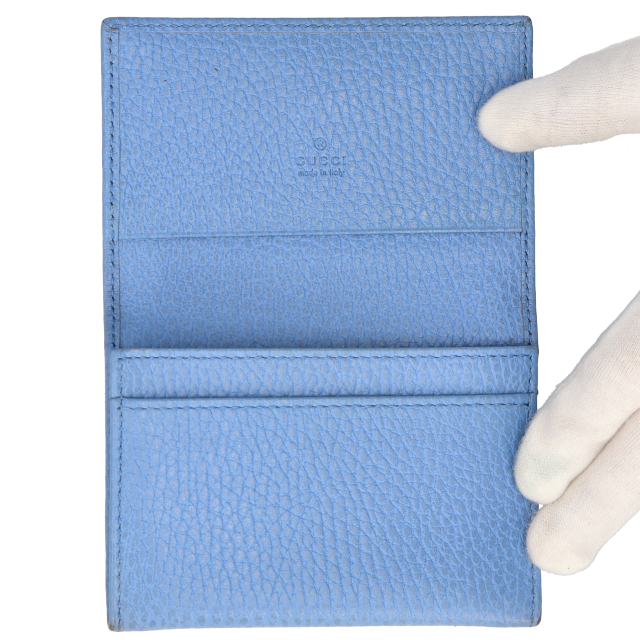 USED品。正面に小さなダブルGのメタルディティールがゴージャスな印象を与えてくれるカードケース。シンプルなデザインに加え、使い込むと味がでるタイプの滑らかなレザーで長くお使いいただけます。カード入れと、オープンポケットが付いていて、収納力もバッチリです。ご自分用にはもちろん、プレゼントにもおススメのアイテムです。