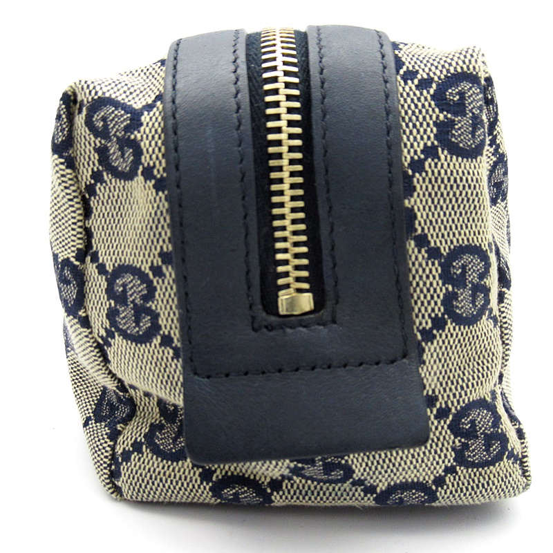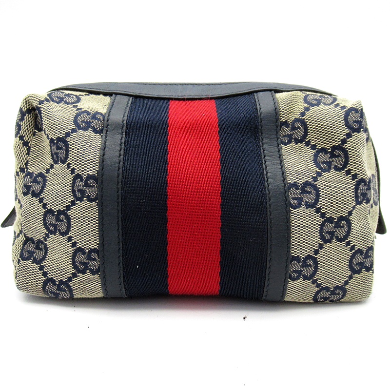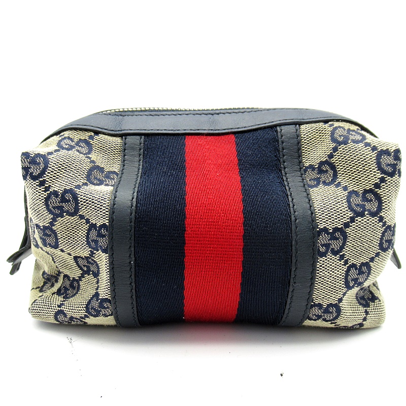 USED品。シックなカラーにシェリーラインが上品に施されたオシャレなポーチです。ファスナーが大きく開くので出し入れしやすくマチも広いので見た目以上の収納力があります。