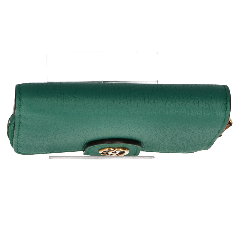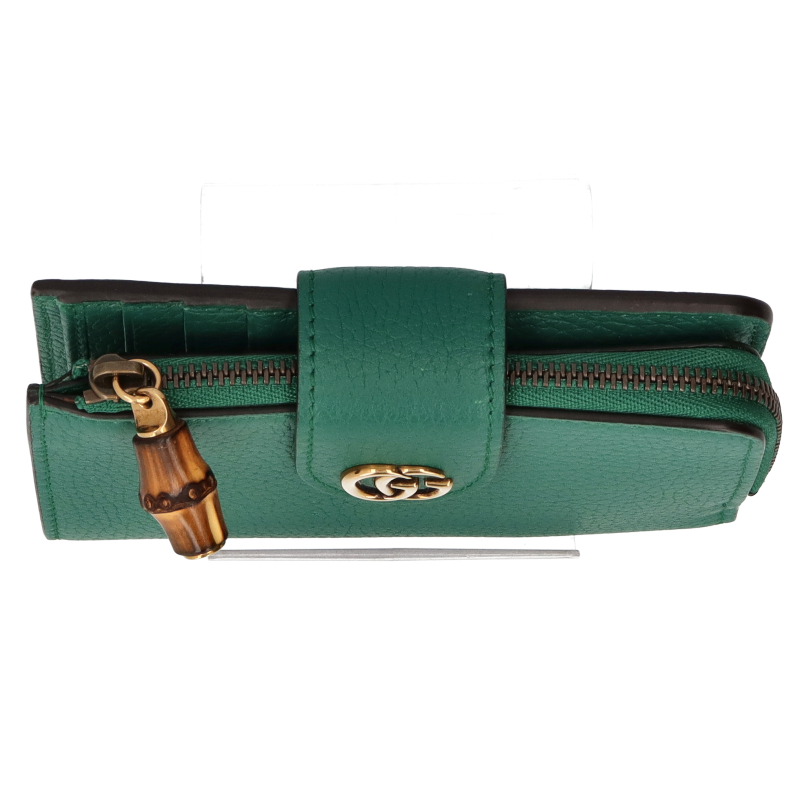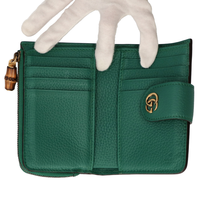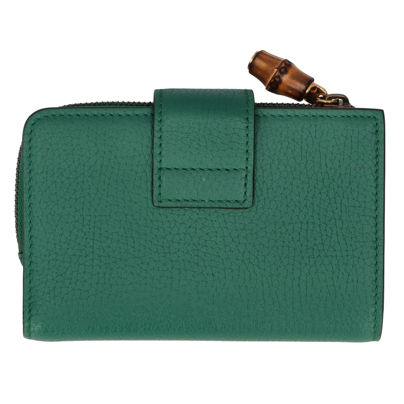 USED品。グッチの歴史の中核となっているバンブー素材へのオマージュを表現したミディアムウォレット。バンブー ジップ クロージャーがデザインのポイントです。気品あるエメラルドグリーンのレザーで仕立て、ゴールドトーンのダブルG ハードウェアをあしらいました。