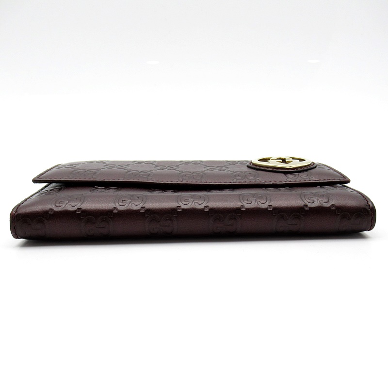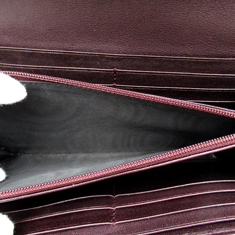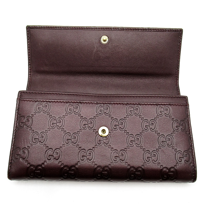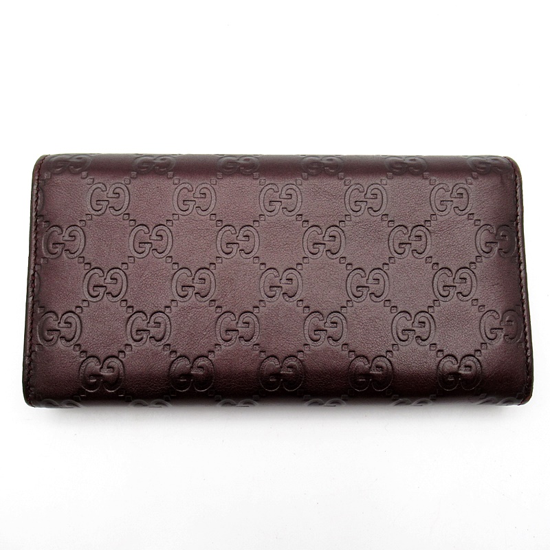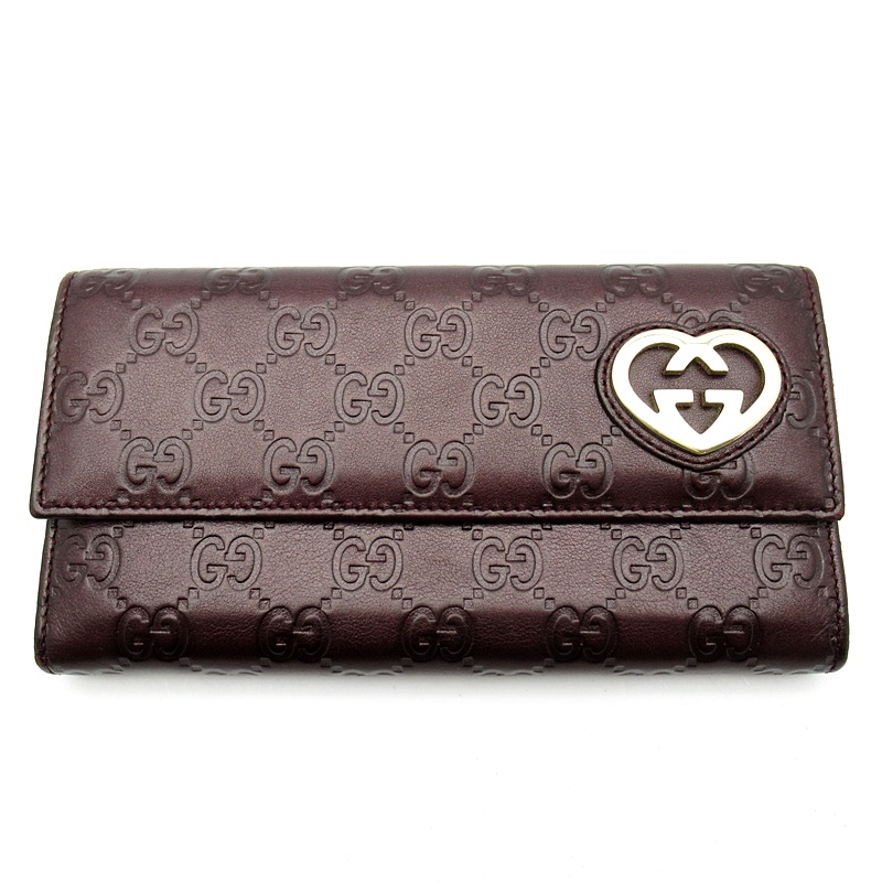 USED品。全体にGG柄が施された、ハートロゴが特徴の長財布。ゴールドのモチーフと深みのあるバーガンディのカラーが素敵なお財布です。