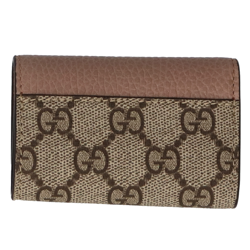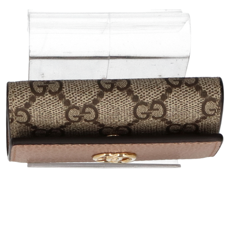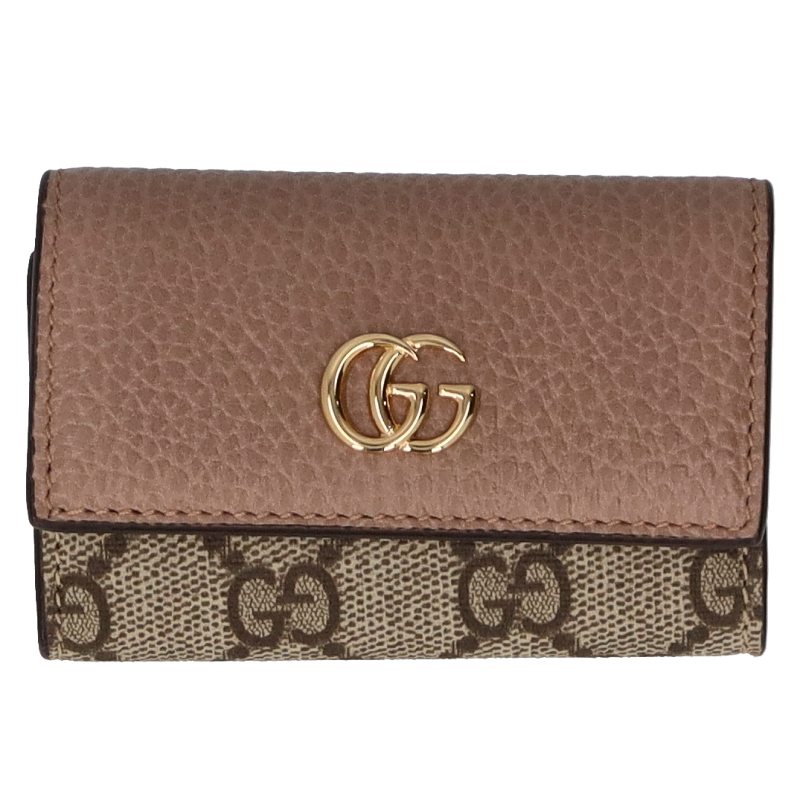 USED品。GGスプリーム キャンバスとダスティピンクのレザーを組み合わせ、グッチを象徴するダブルGの小さなハードウェアをあしらったキーケース。内側にはキーフックを6つ備えています。