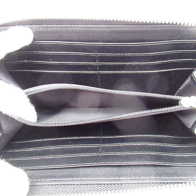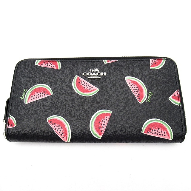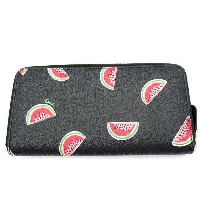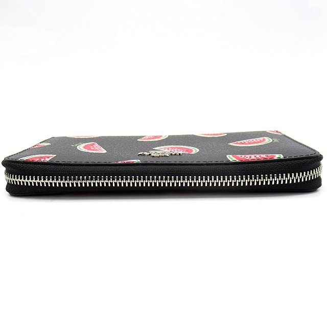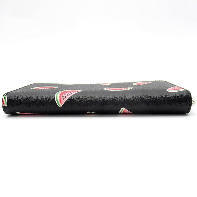 USED品。ダークネイビーのPVCコーティングキャンバスにスイカのプリントがかわいい長財布です。収納力と機能性も抜群のアイテムです。