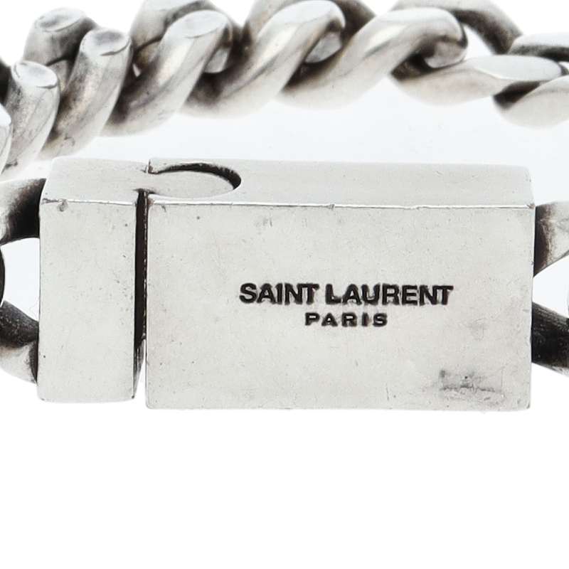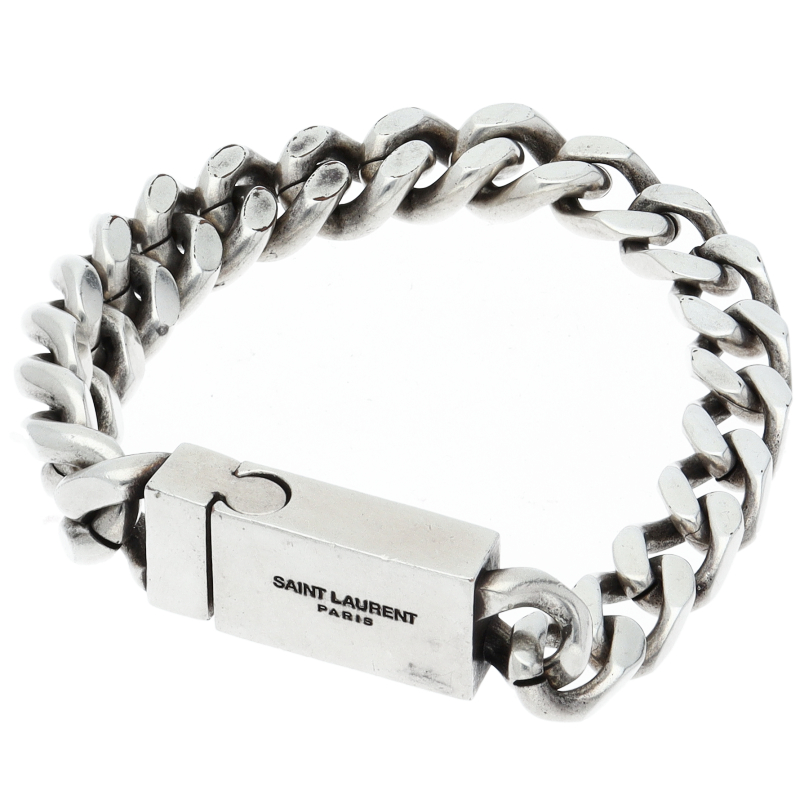 USED品。SAINT LAURENT PARISのエングレーブ入りメタルプレートをあしらったカーブチェーンのインターウォーブンブレスレットです。