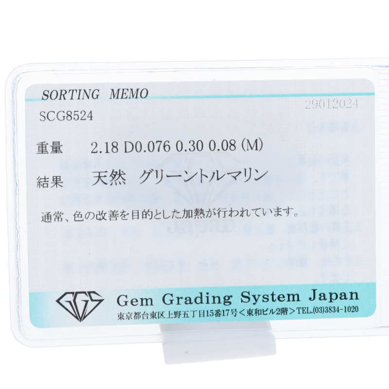 | 特徴 | グリーントルマリン:2.18ct 0.30ct 0.08ct ダイヤ:0.076ct |