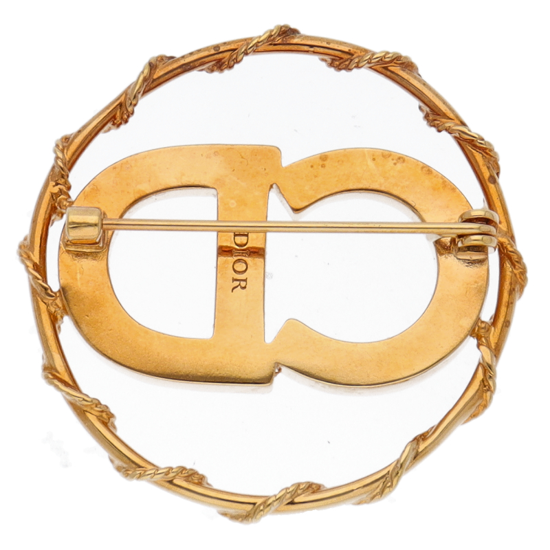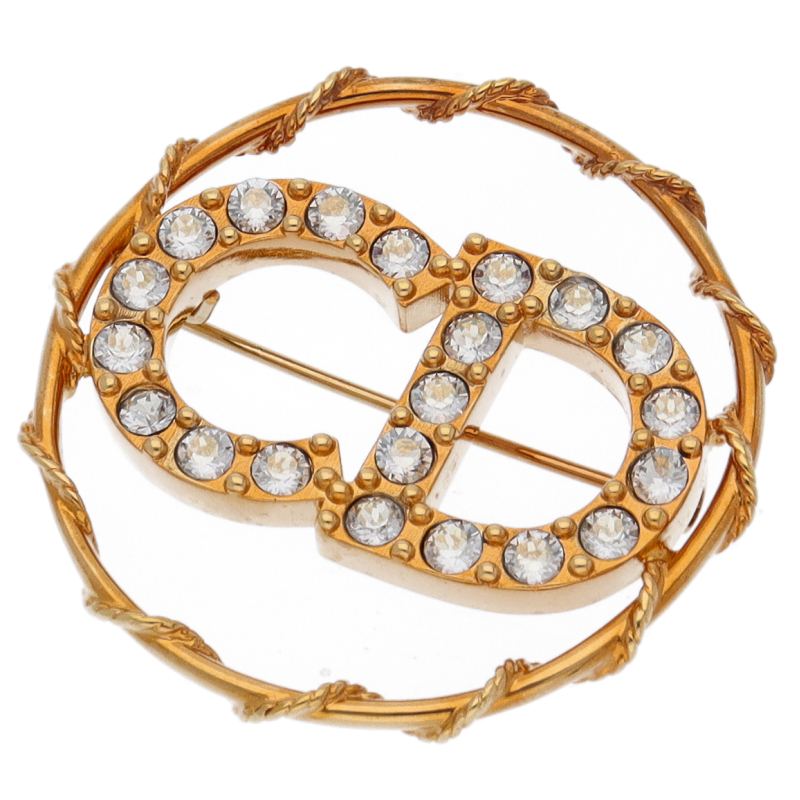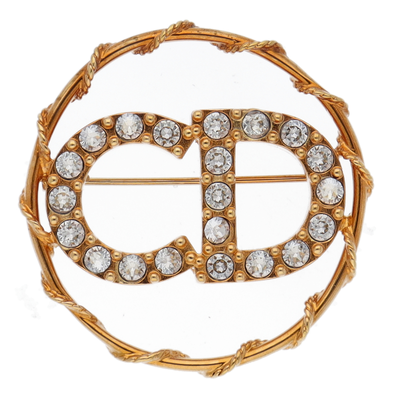 USED品。クリスタルをセットしたCDイニシャルを、スターモチーフを散りばめたゴールドトーンメタルのサークルで囲んだブローチ。シンプルなデザインながらも存在感があり、様々なファッションに合わせやすいお勧めのお品です。