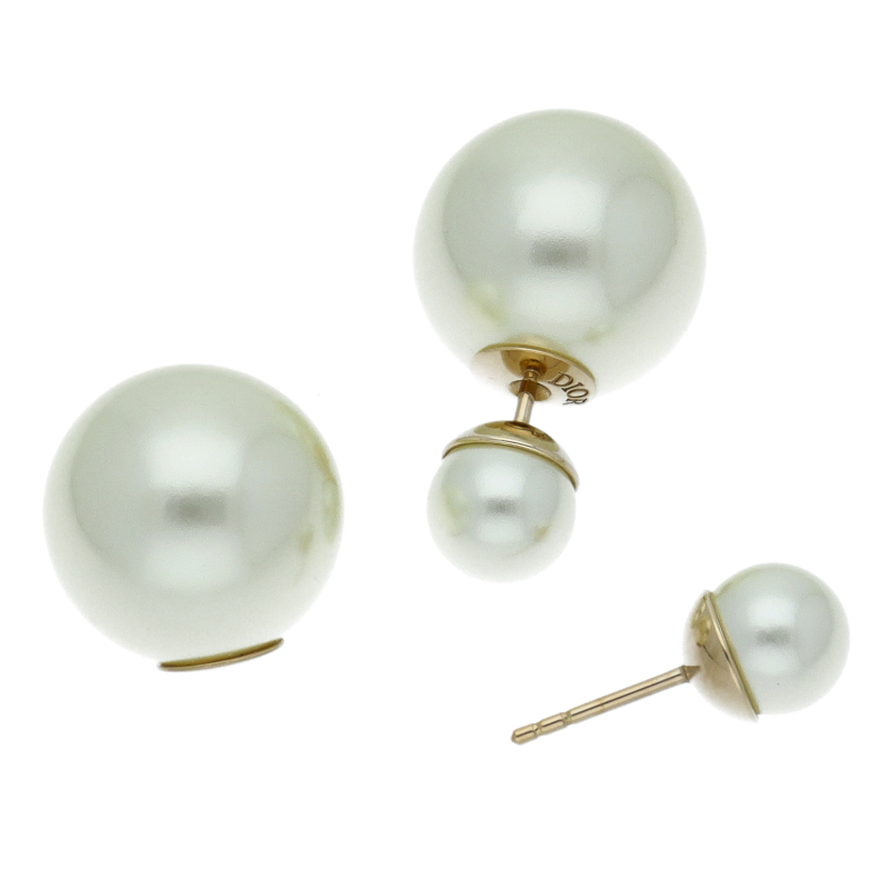 USED品。正面に小さめのフェイクパールが、耳たぶの裏側からは大きなフェイクパールが覗く、シンプルですが耳元を華やかに演出してくれるピアスです。