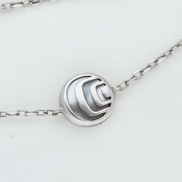 USED品。スターリングシルバー製。アイコニックなダミアニッシマモチーフにシェルをセットしたフェミニンなネックレスです。大小のモチーフが存在感にあふれ、コーディネートをよりエレガントに仕上げてくれます。