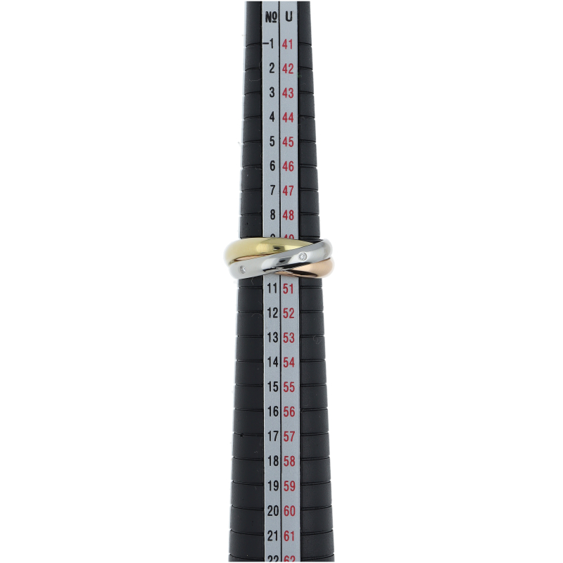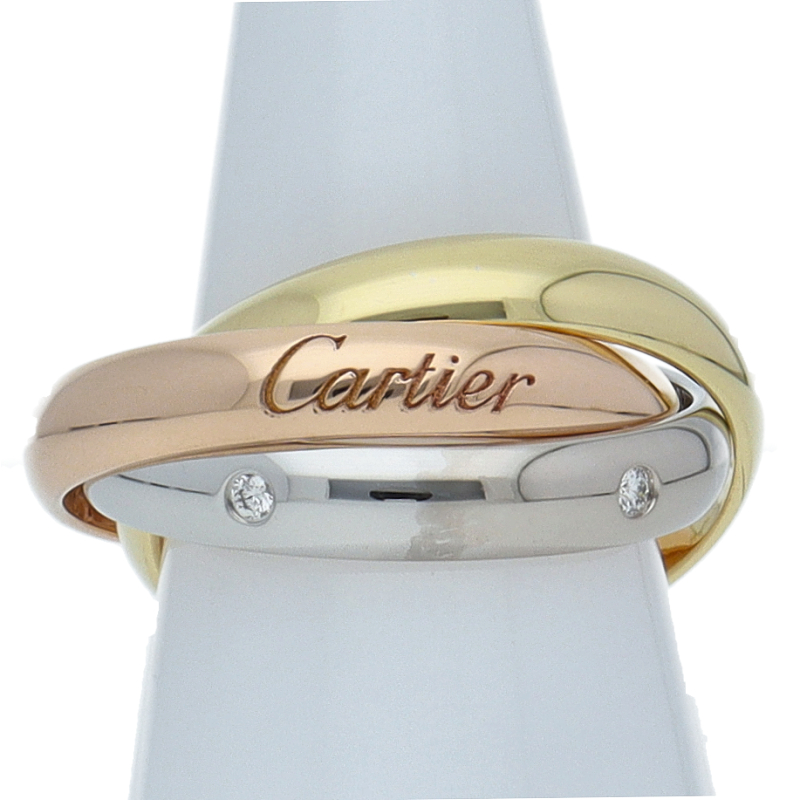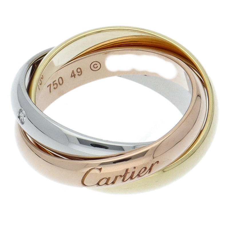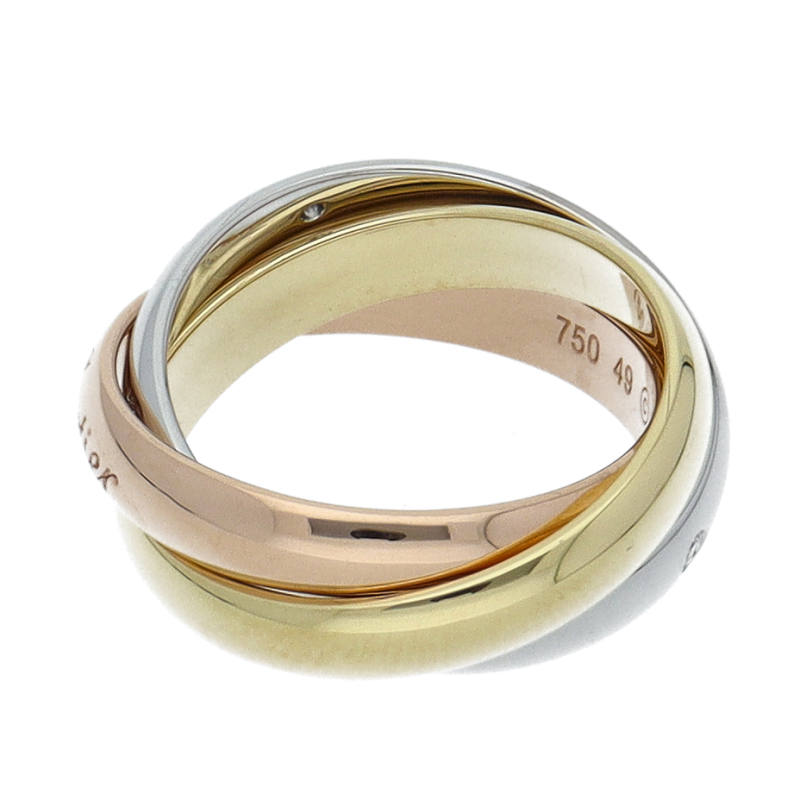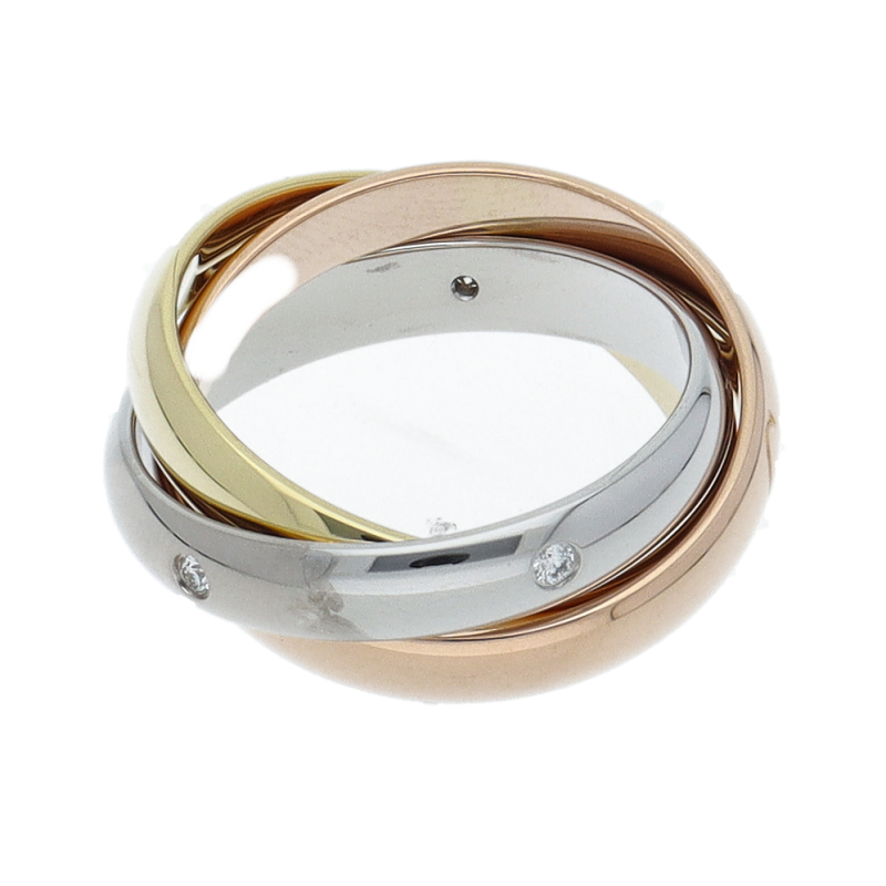 USED品。3カラー製。神秘と調和に満ちて絡み合うトリニティリングは3色のゴールドから出来ており、ピンクは愛を、イエローは忠誠を、ホワイトが友情を象徴します。更に5Pのダイヤが入り高級感が増しております。