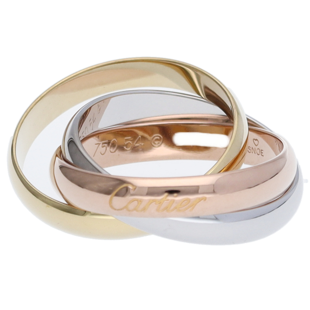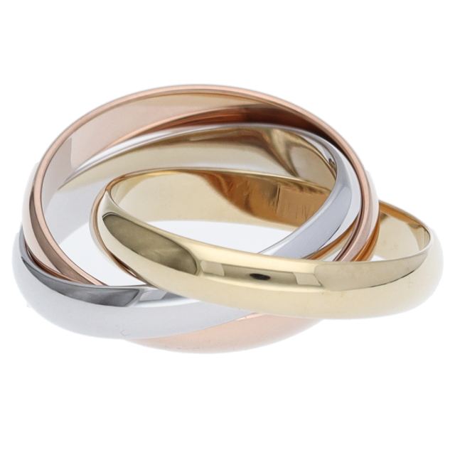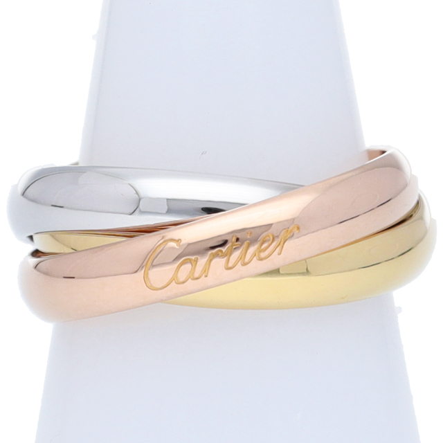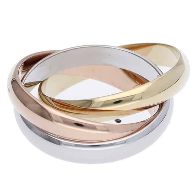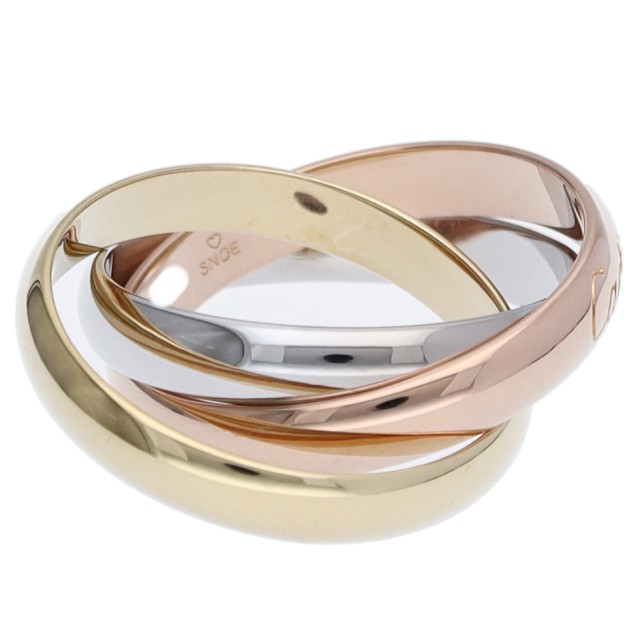 USED品。3カラー製。ピンクが愛、イエローが忠誠、ホワイトが友情を象徴するカルティエの人気のトリニティコレクションです。
