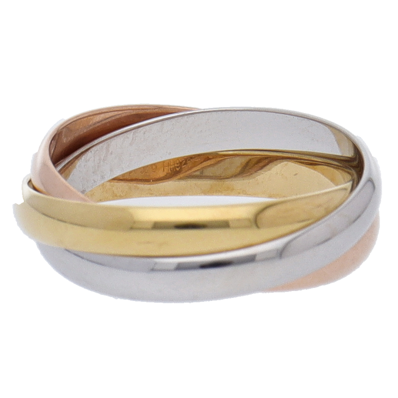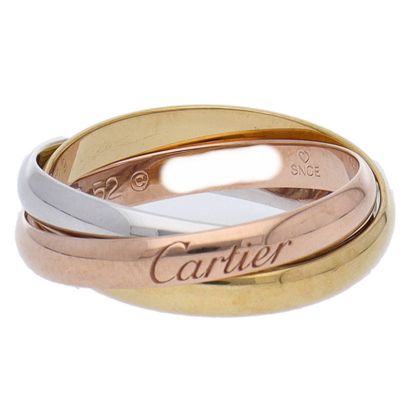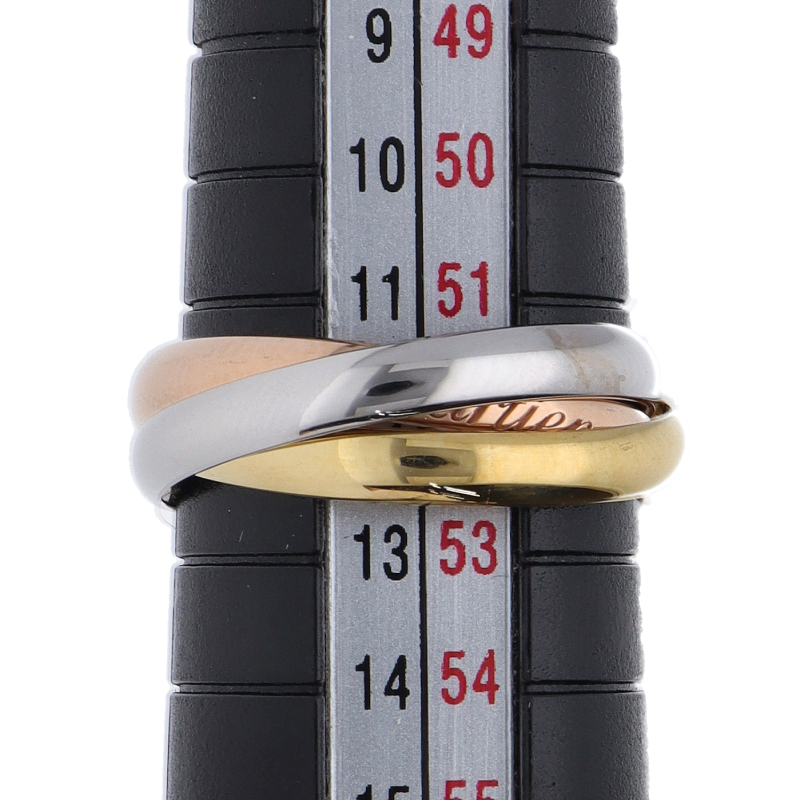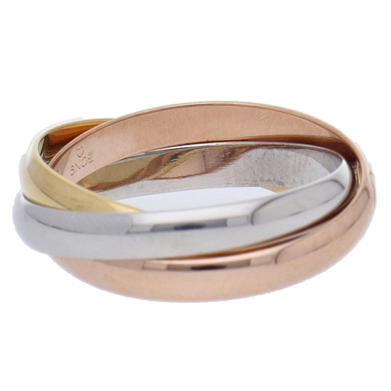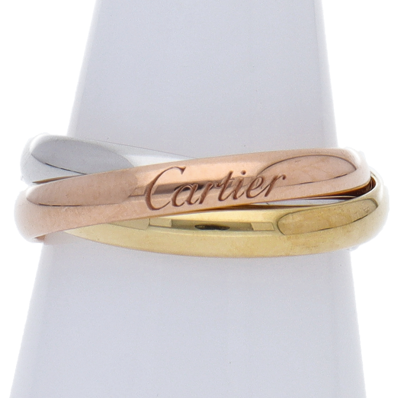 USED品。3カラー製。ピンクが愛、イエローが忠誠、ホワイトが友情を象徴するカルティエの人気のトリニティコレクションです。