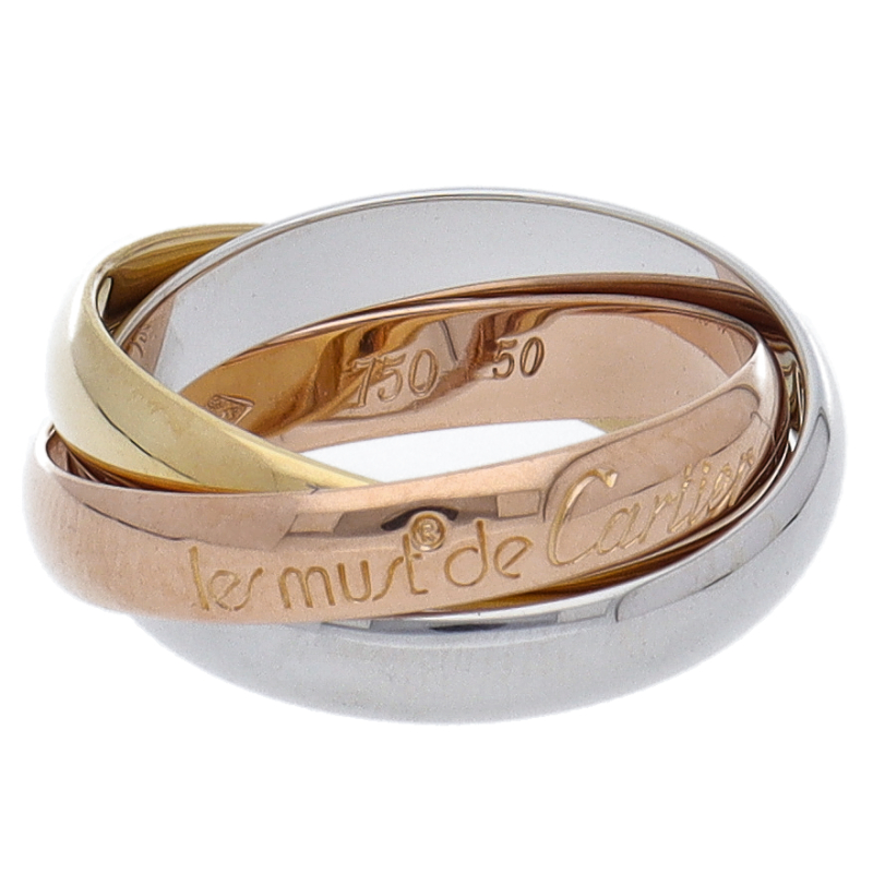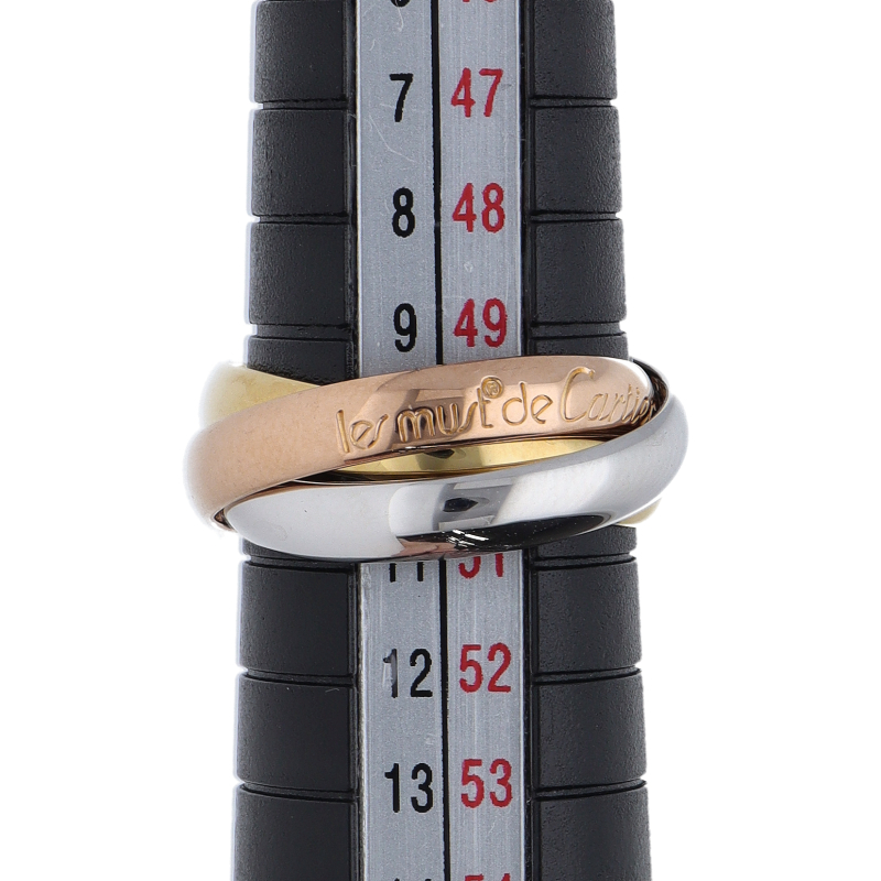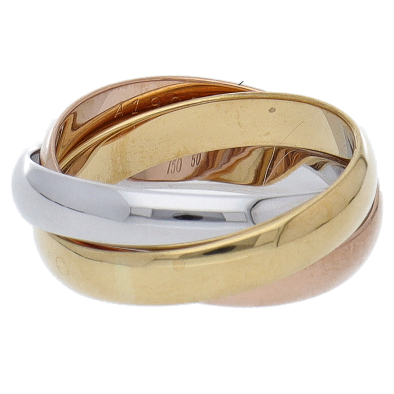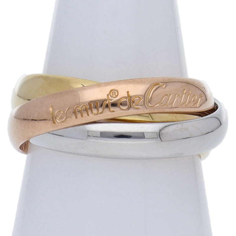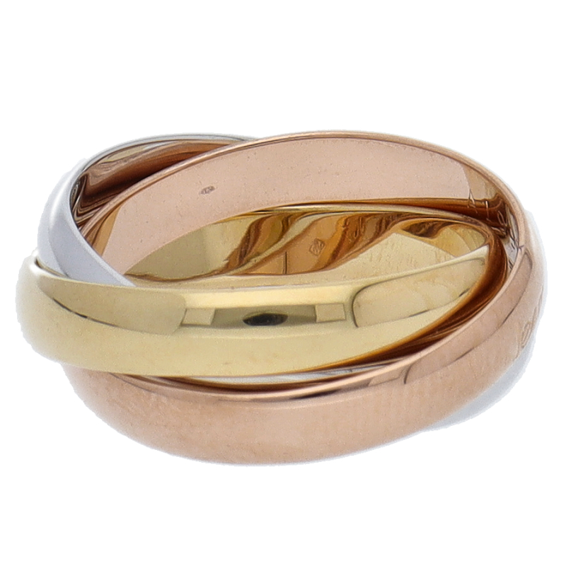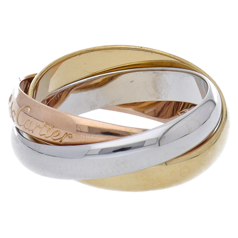 USED品。3カラー製。ピンクが愛、イエローが忠誠、ホワイトが友情を象徴するカルティエの人気のトリニティコレクションです。