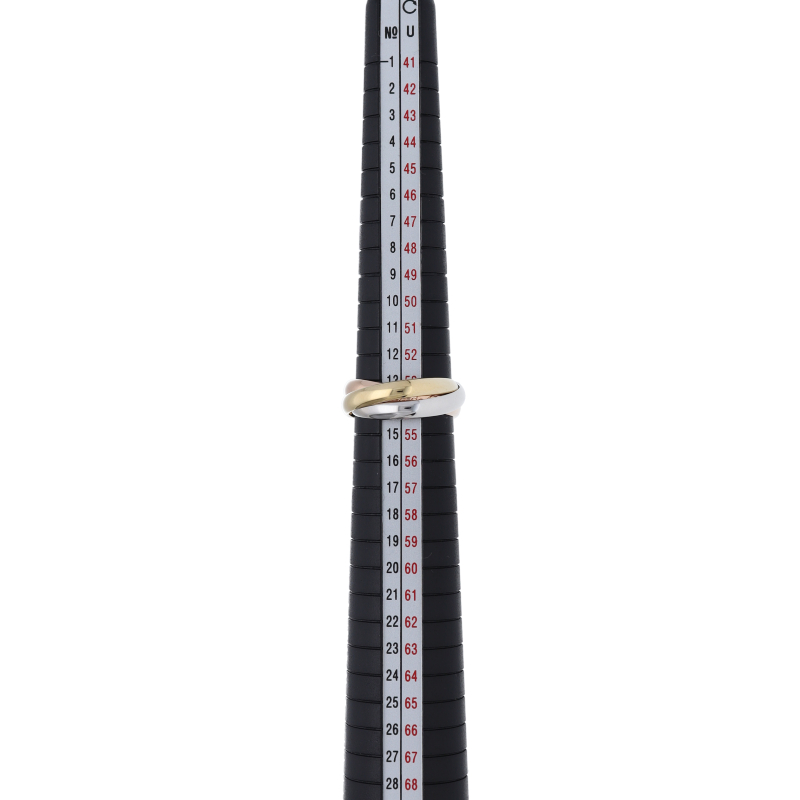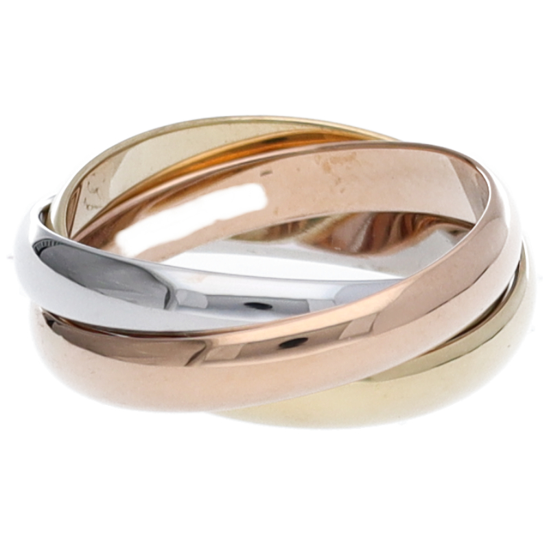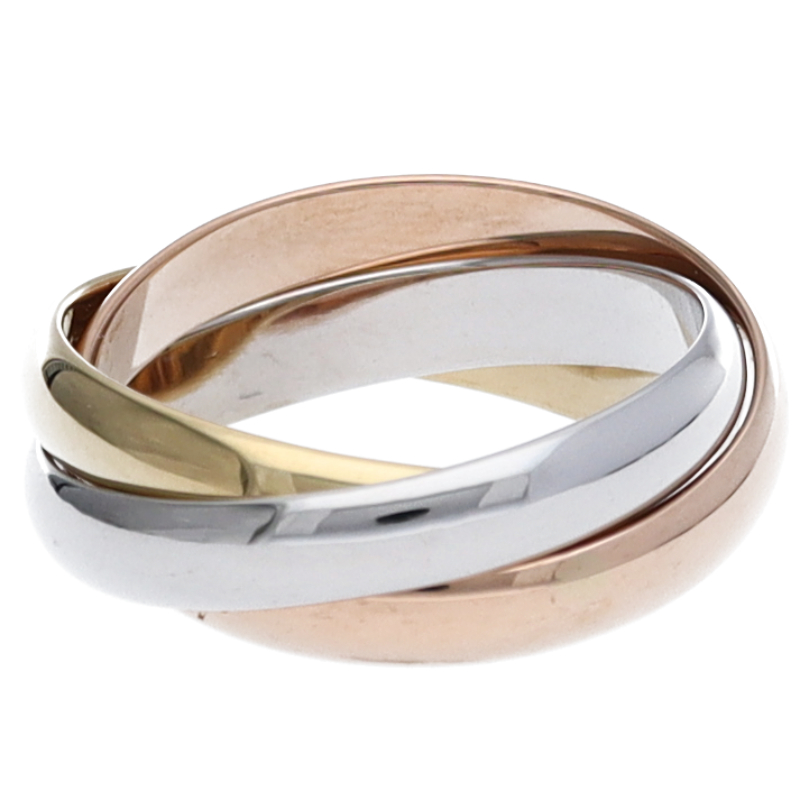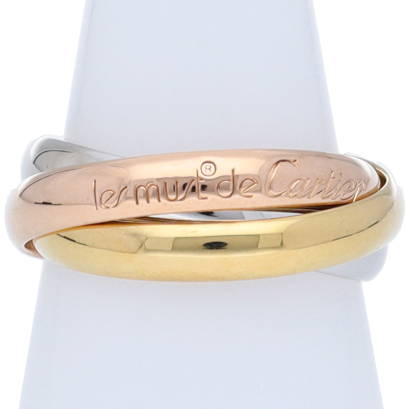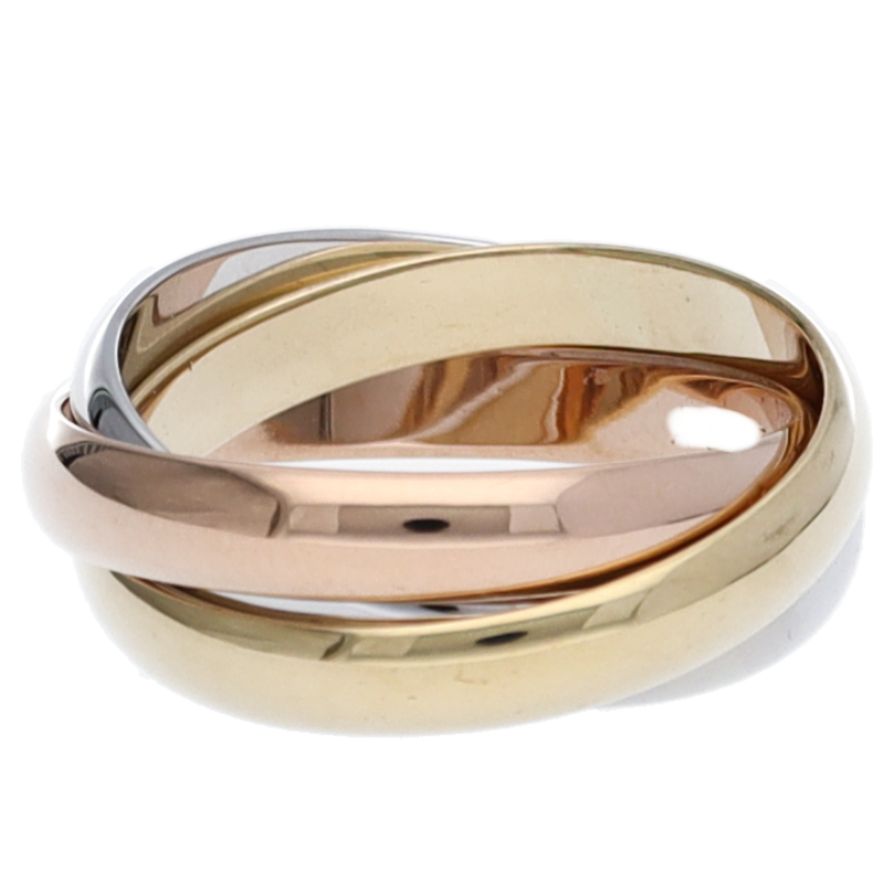 USED品。3カラー製。ピンクが愛、イエローが忠誠、ホワイトが友情を象徴するカルティエの人気のトリニティコレクションです。